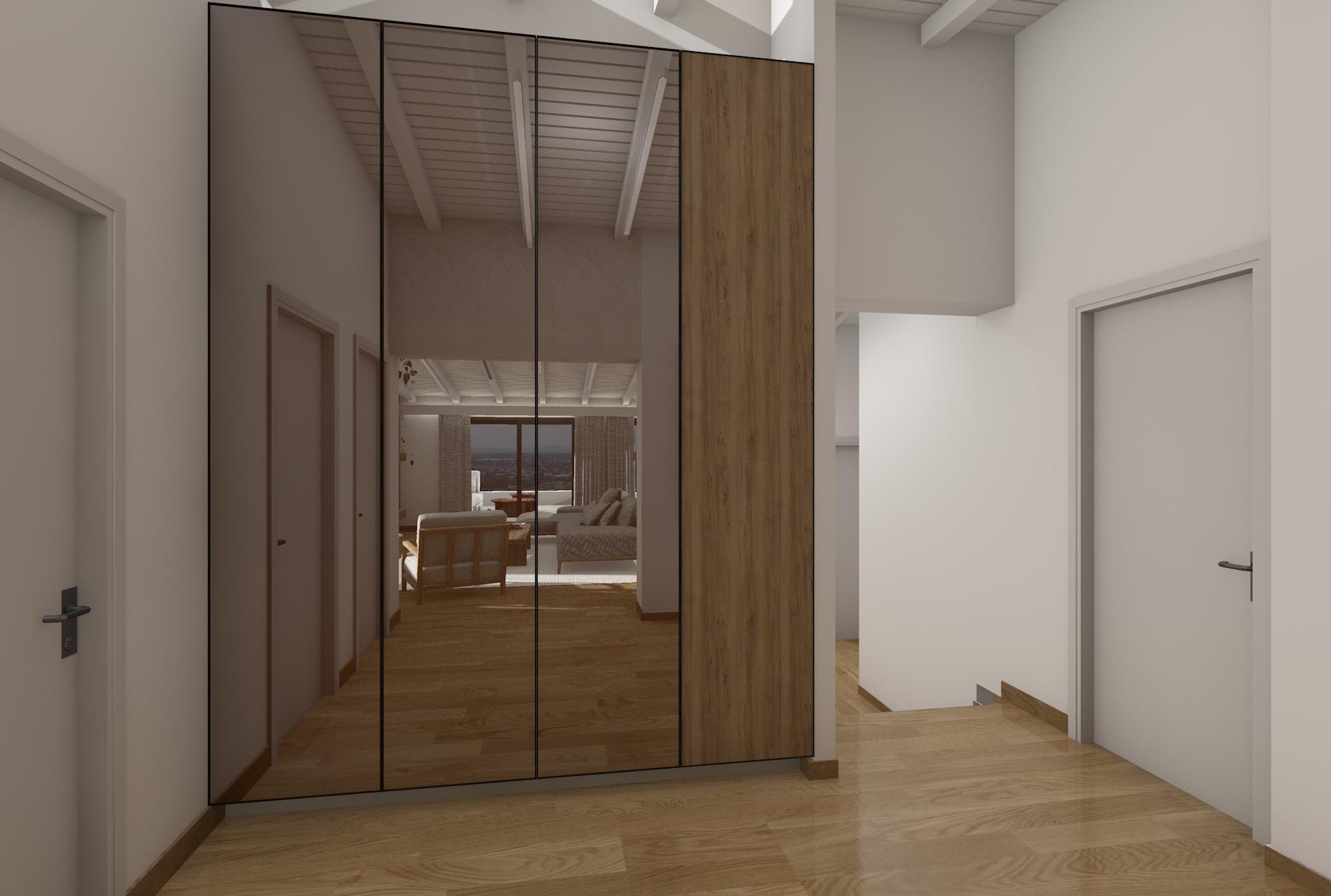 centered between the shelving units there is a four door wardrobe featuring bronze tinted mirror panels realistic wood mat floor