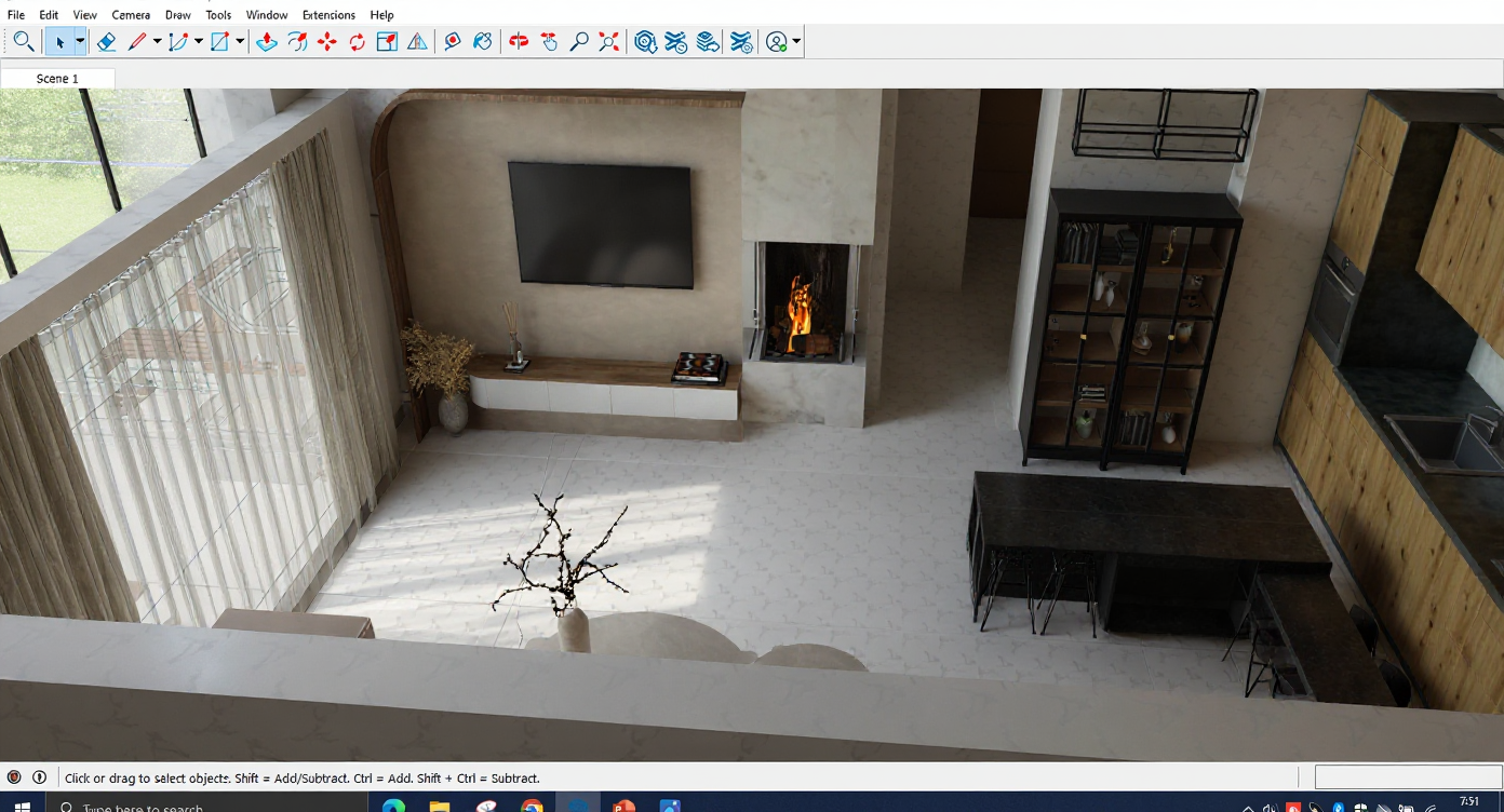 generate a hyper realistic render of the villa living room dont change anything keep the spatial design identical to the reference enchance materials lighting and textures for the photorealism change the sofa and chair fabric with wool change those 2 round table material to terrazzo add food and drink to the table make the plants more realistic sky and lighting warm golden hour sunset bright cozy natural ultra high resolution like a ultra high resolution like a professional architectureal photo architecture