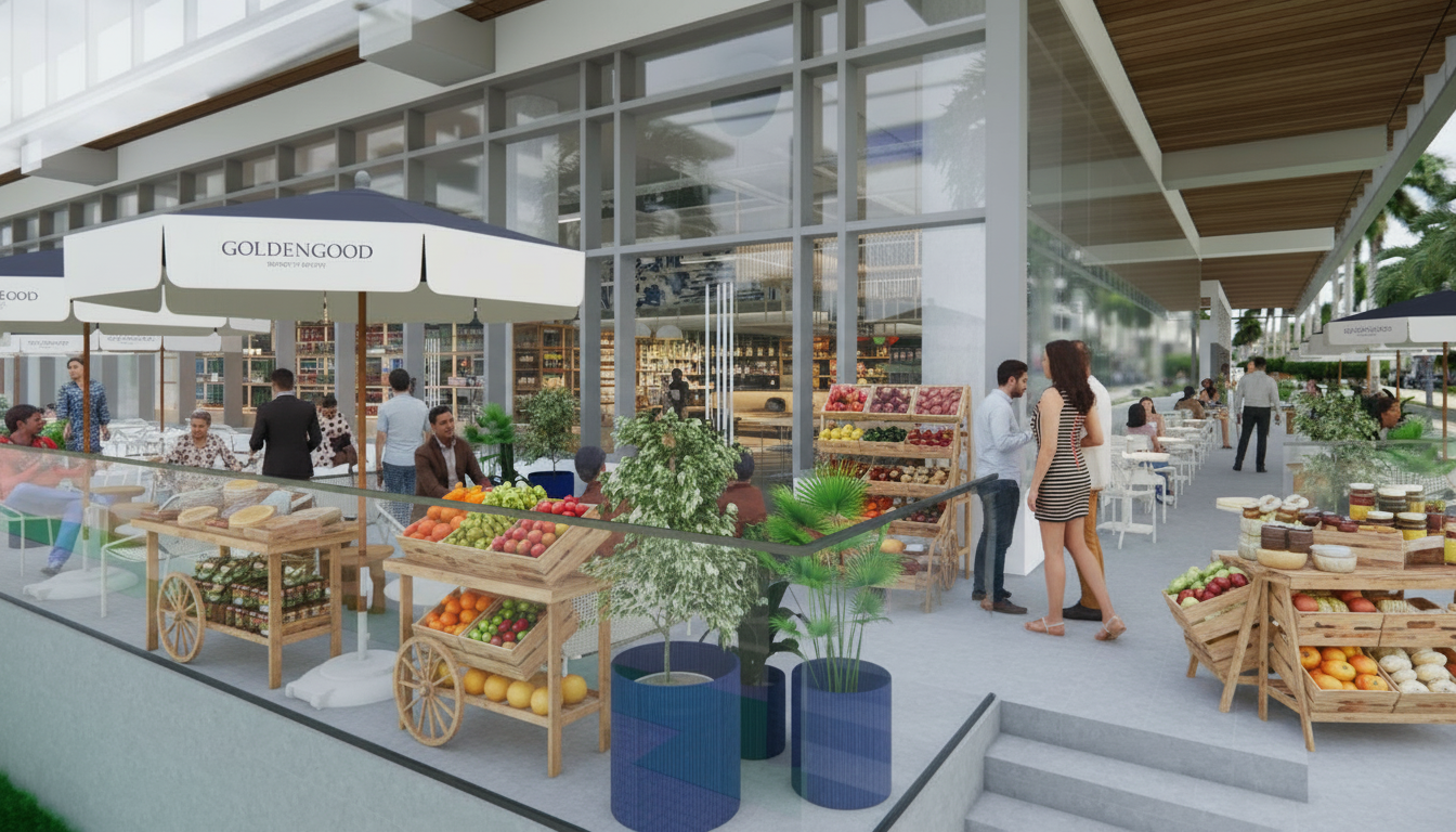 fai soffitto con illuminazione a quadrotti sparsi posizionati in maniera regolare mantieni colori originali fai una vista bella luminosa