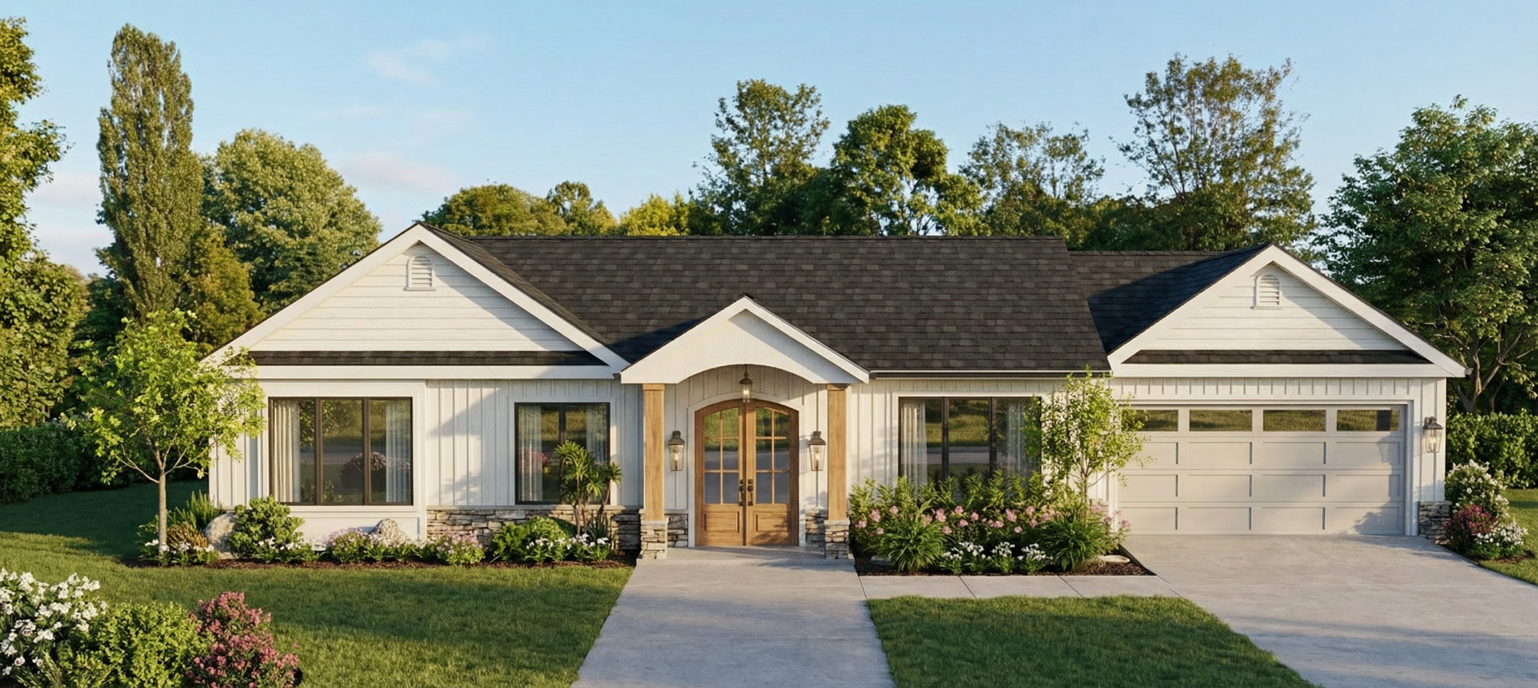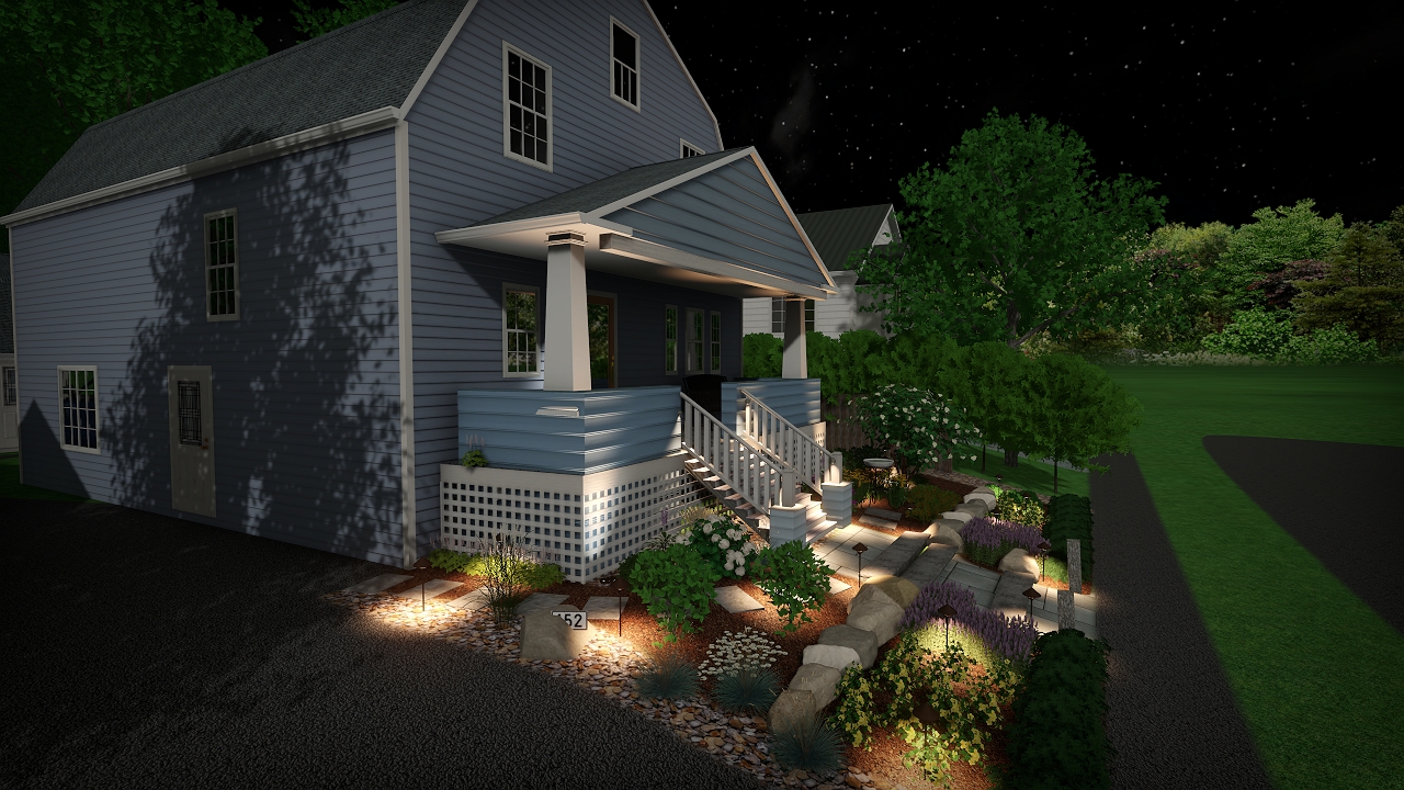 night time landscape with landscape lighting