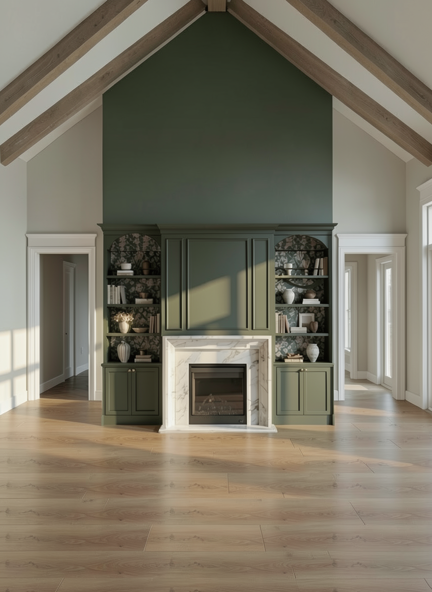 show me a rendering of this fireplace elevation surround will be the one in the mood board base cabinetry and open shelves will be the warm dark alder color the upper cabinets will be a putty taupe gray color solid no glass black countertops mantle surround is the one in the refernce photo samsung frame tv above the 54 high mantle and has a goldframe open walkway to right of fireplace but there is still a wall that the cabinets will die into no hearth on the floor and the tile from fireplace to mantle will all be black no tile on floor in front of fireplace do not show light fixtures keep straigt on angle