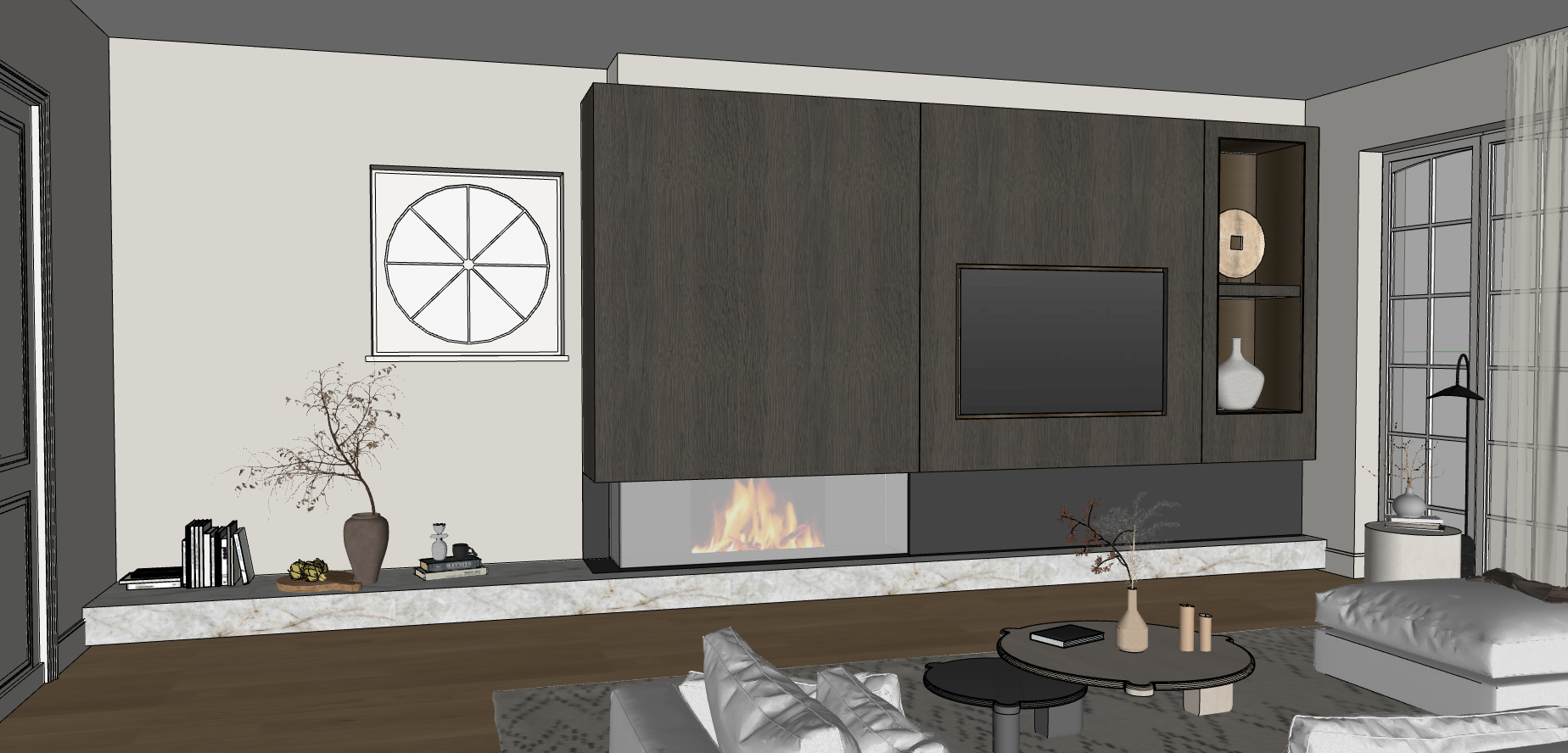 maak fotorealistisch behoud het ronde raampje met zicht naar buiten voorzie de tv gelijkliggend met het haardmeubel