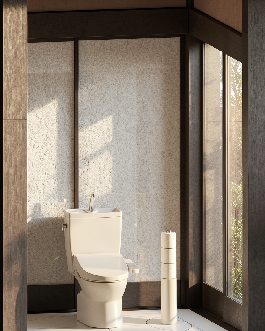 a model of a house add few rees in background for context add very few bt neat vegetation with floral ones for context too the upper walls should be beidge very light brownish retaining the three horizontal key lines give picture sunsety vibe 3 4 p m add creamish interior ighting very faint balcony you see on left side is glass