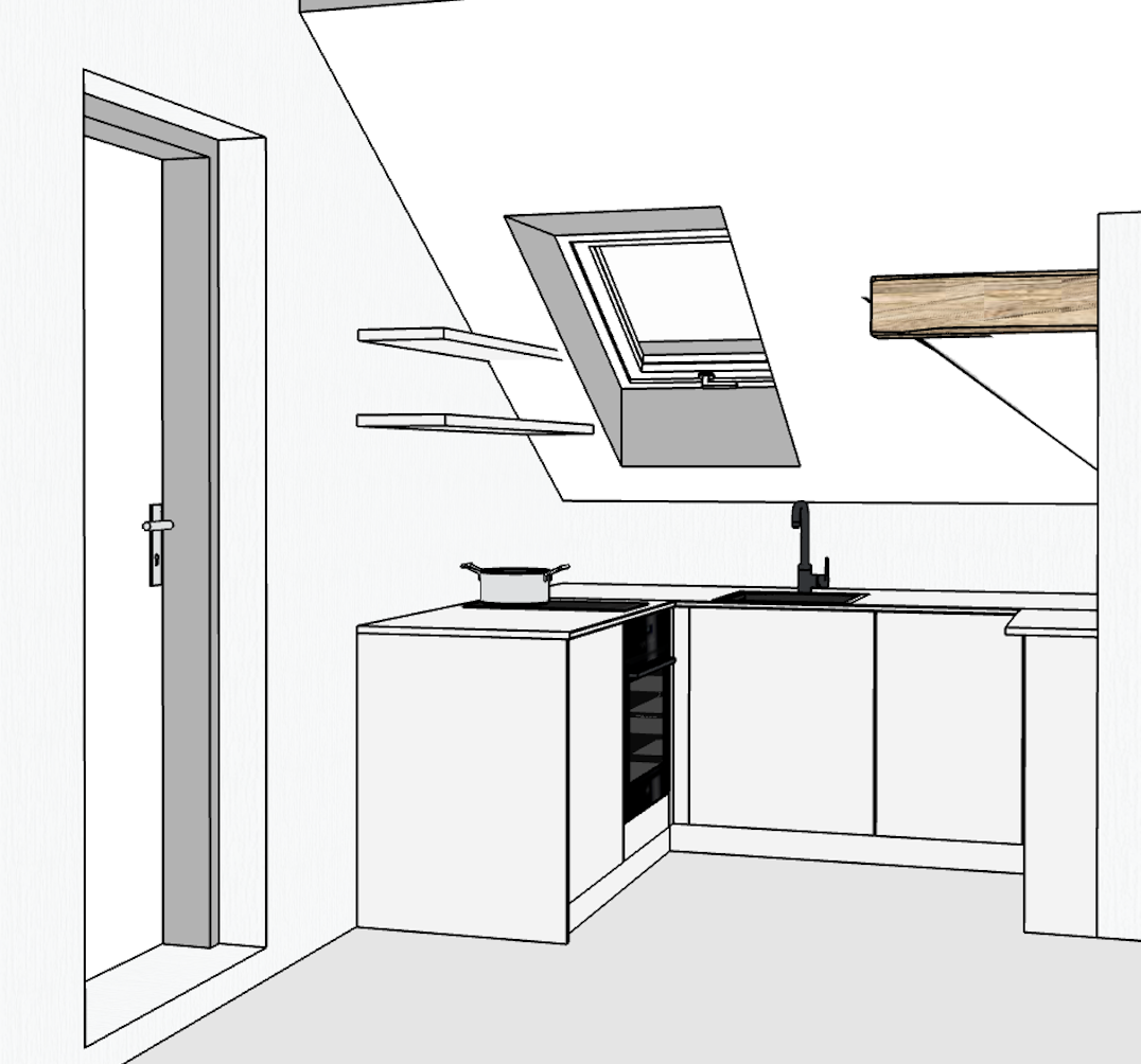 interior shot the cabinets are matte marsala the shelves are american walnut the walls are textured linen wallpaper the faucet is matte graphite the countertop is beige stone the floor is large dark gray tiles add mugs plates and glasses to the shelves add a kettle and toaster to the countertop add a linen blind to the window the doors are american walnut
