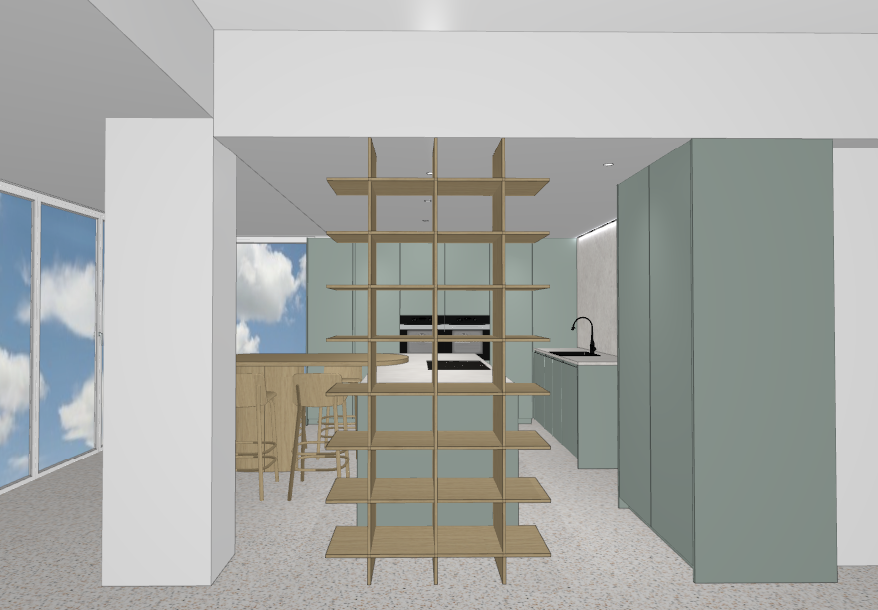 a modern kitchen with soft greens woods and a terrazzo floor the worktop is a light textured offwhite matt worktop