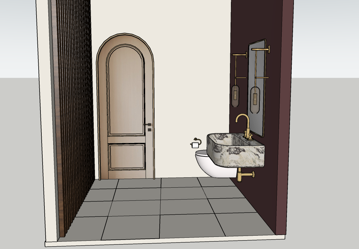 render this bathroom scene as a photorealistic interior do not change the design colors proportions materials fixtures or layout keep the exact camera angle and composition the room has no windows so do not add natural light or window shadows use soft even ambient lighting and subtle fixture based illumination to enhance realism maintain all existing elements exactly as shown only improving material depth reflections subtle shadows surface texture and overall clarity while keeping the lighting consistent with a windowless space