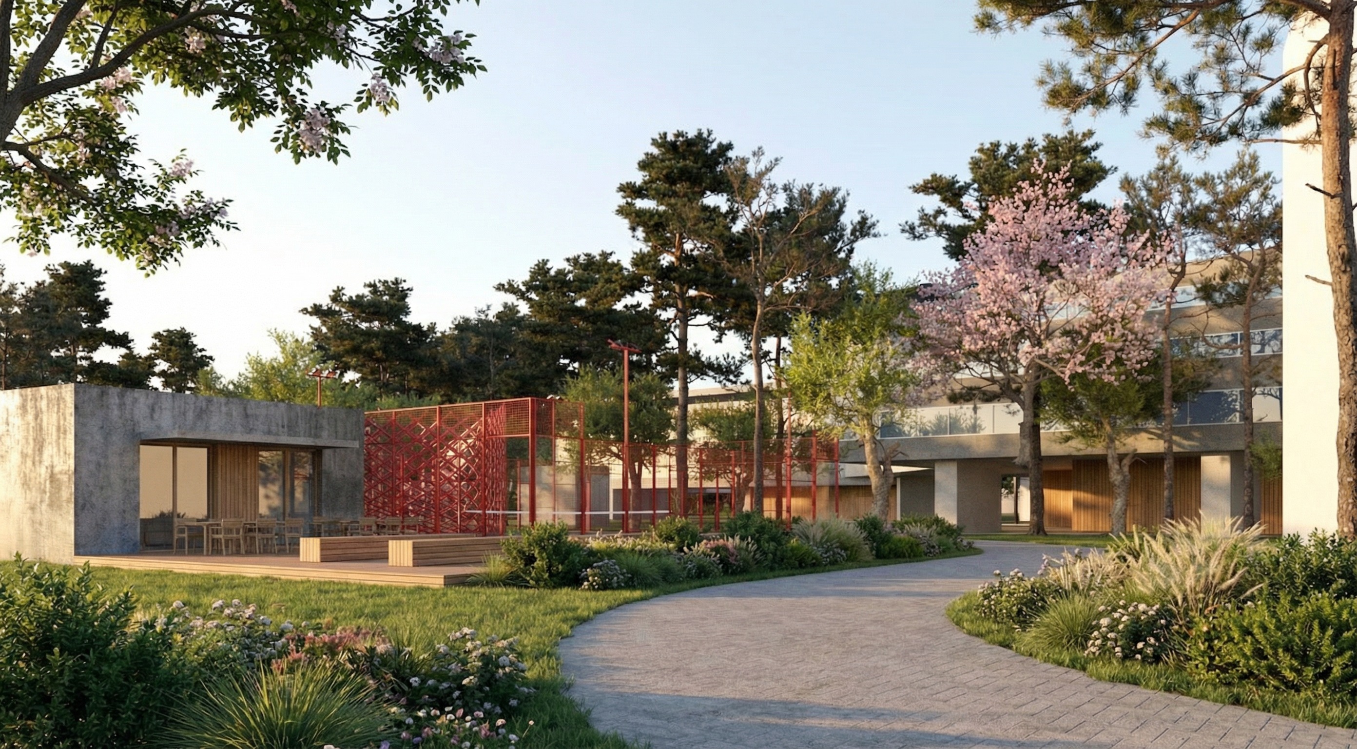 add more transparency to the windows and vegetation on the balconies remove the red net in the background do not make the wooden frame make it from the same pavement as the path but worn down by the grass