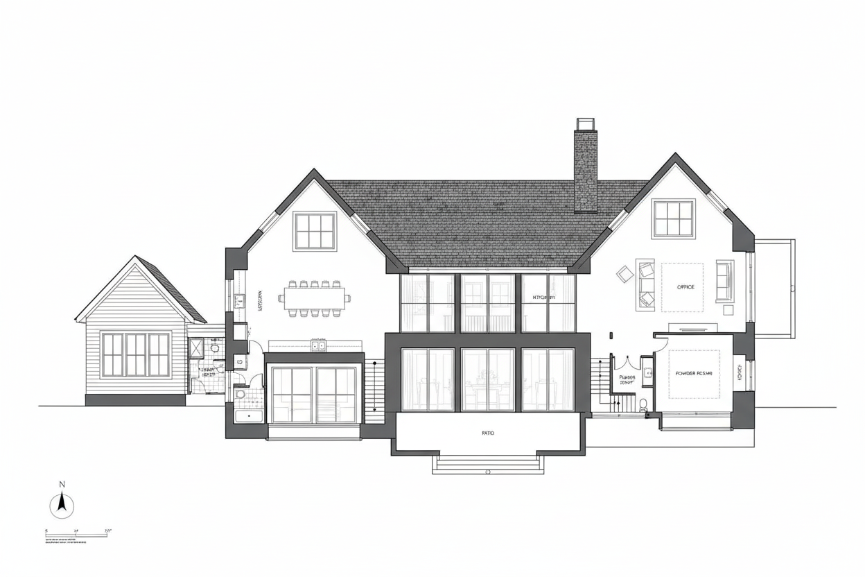 create a rendering of this elevation of a residential home with a screened porch a retaining wall with a seat wall and stairs in a residential golf course setting the stairs lead down to backyard lawn with no sidewalk