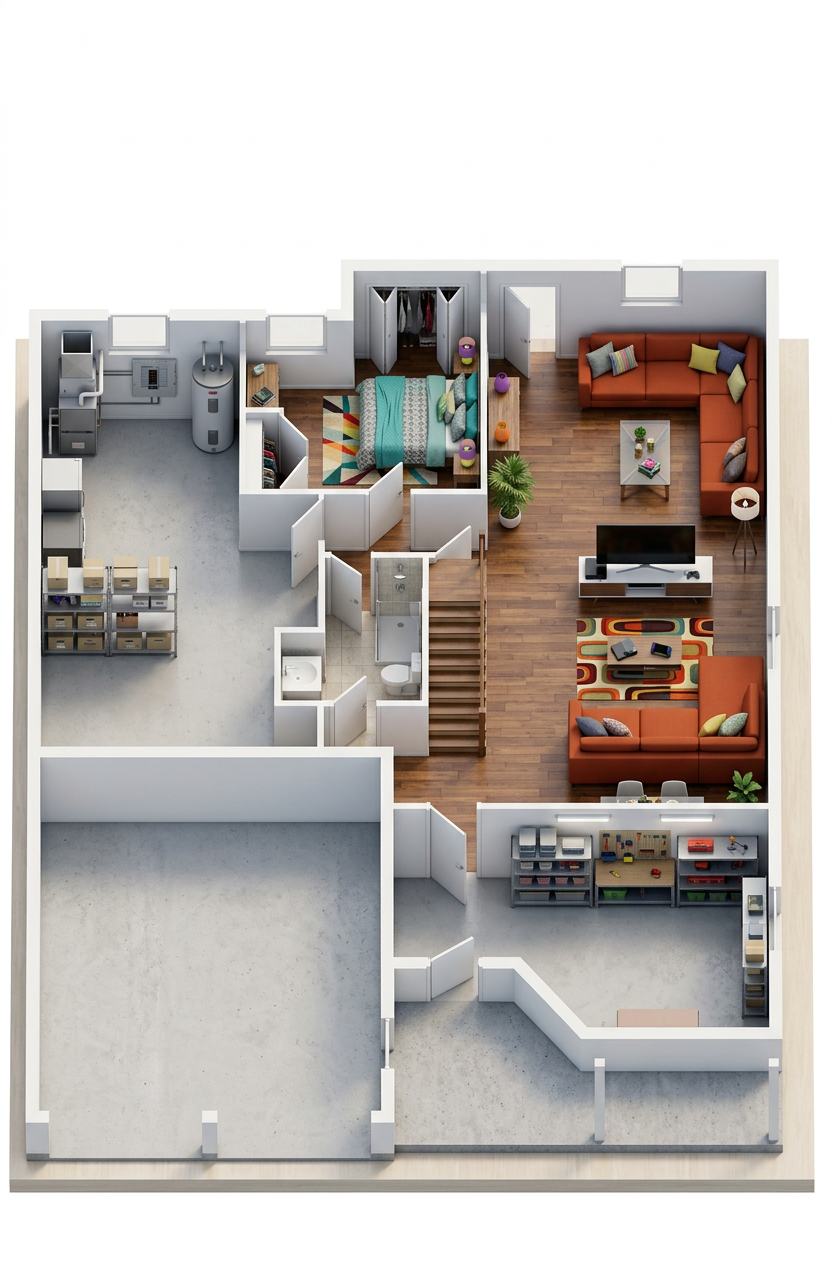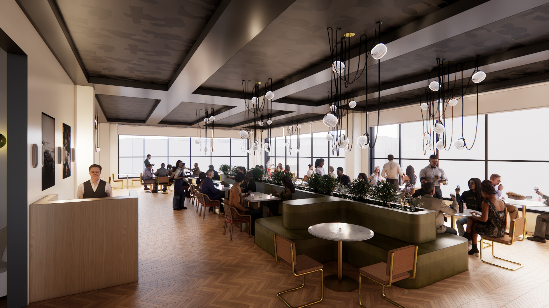 the background out the windows is supposed to be in nashville tn 37206 on the second level of the building can you help add in a little more greenery where the plants are to fill it out also can you also make the green banquet bench look more realistic it supposed to be velvet please do not change anything else in the image it needs to stay looking like my rendering in enscape