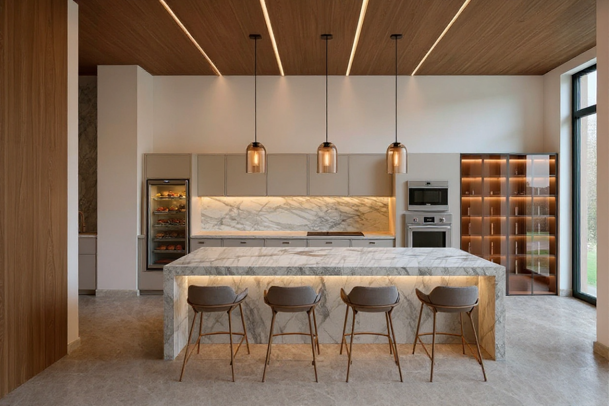 its a house with off white horizontal siding with light grey color stone on the foundation the garage wall has vertical siding the roof is asphalt shingles add light fixtures on both ends of the garage wall and one light fixture on the porch wall add a stone path from the porch to the driveway add trees and plants on the background and the sky has some clouds and the sun hits from the front