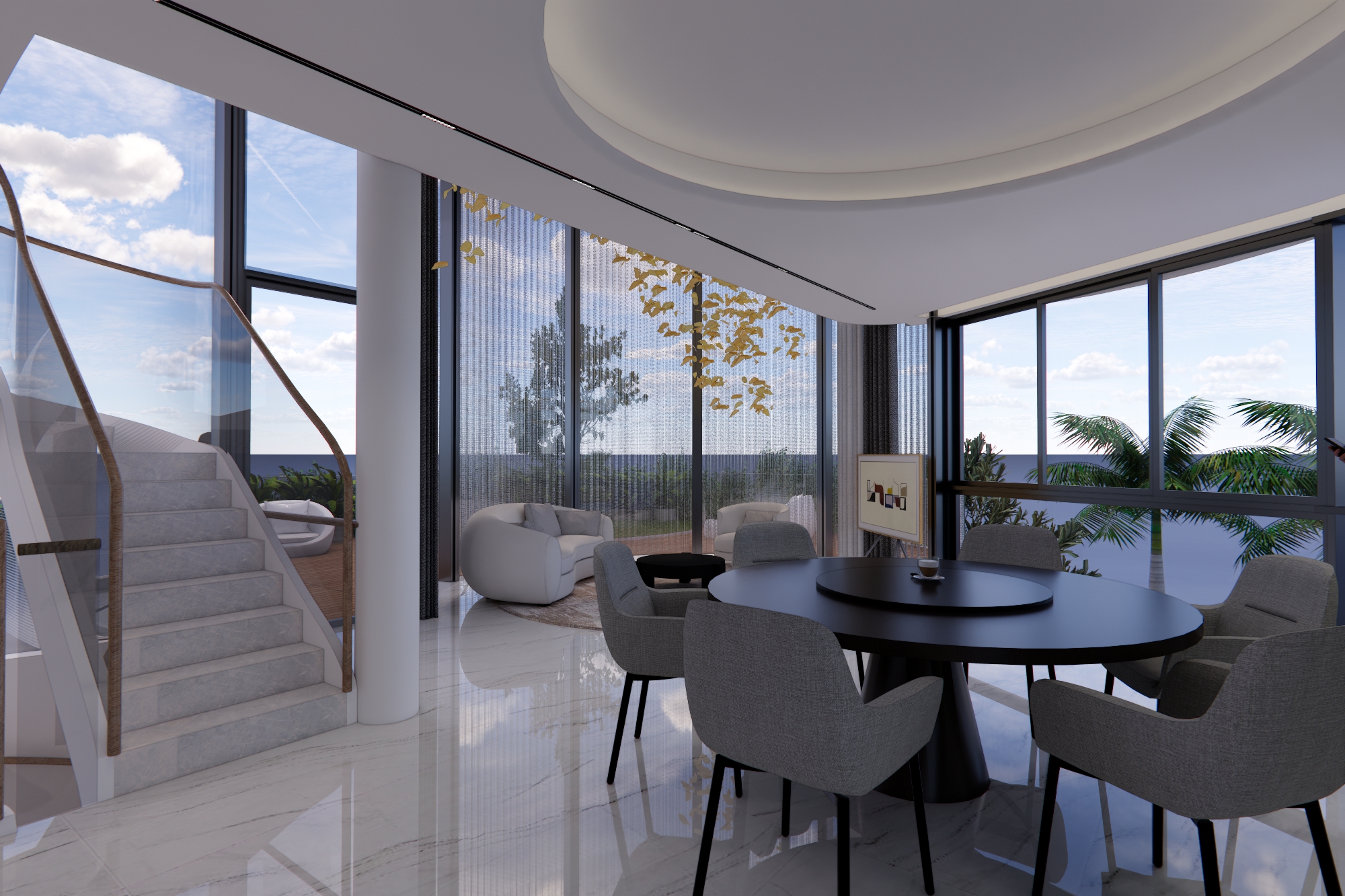key everything including materials finishing touch up with mediterranean themed plants artwork wood in light oak decor but do not obstruct any doors or openings add lights above
