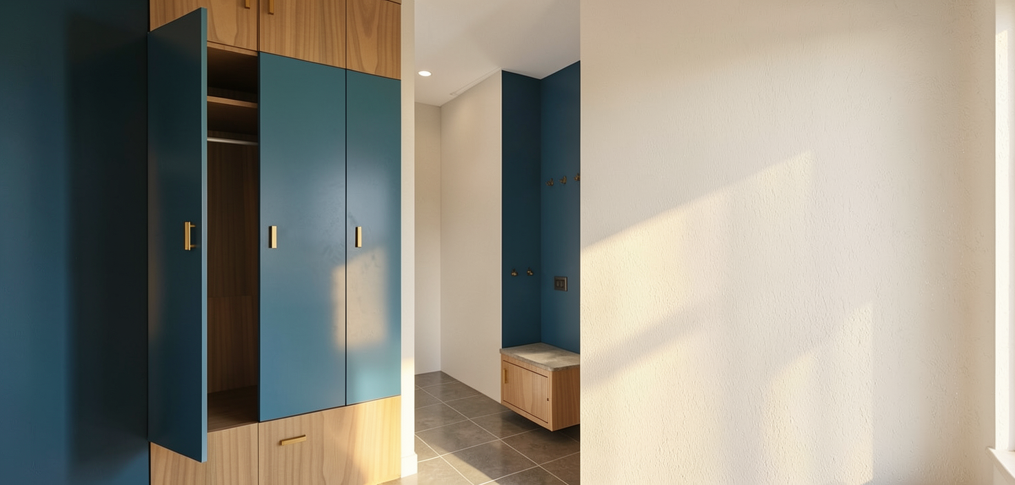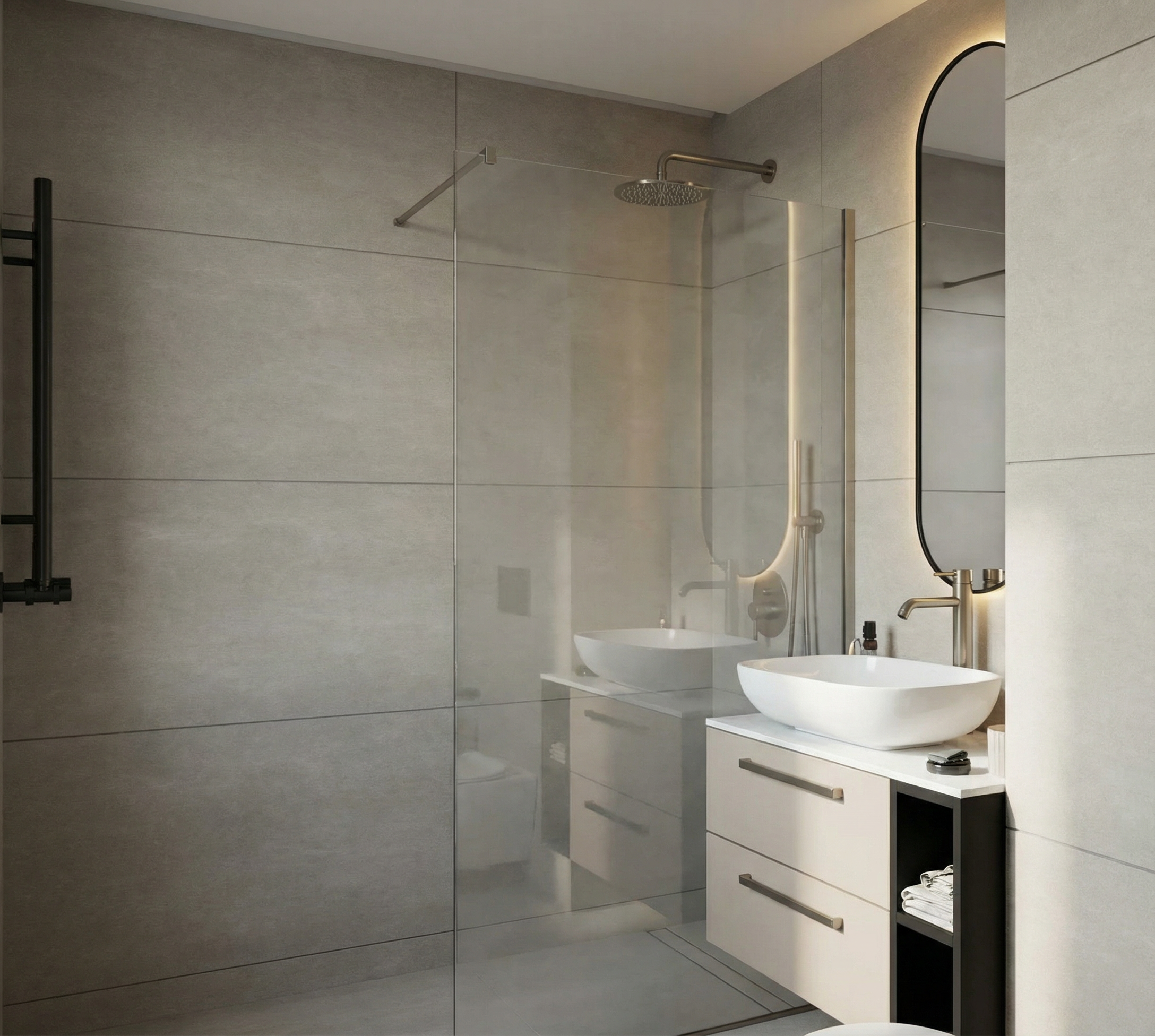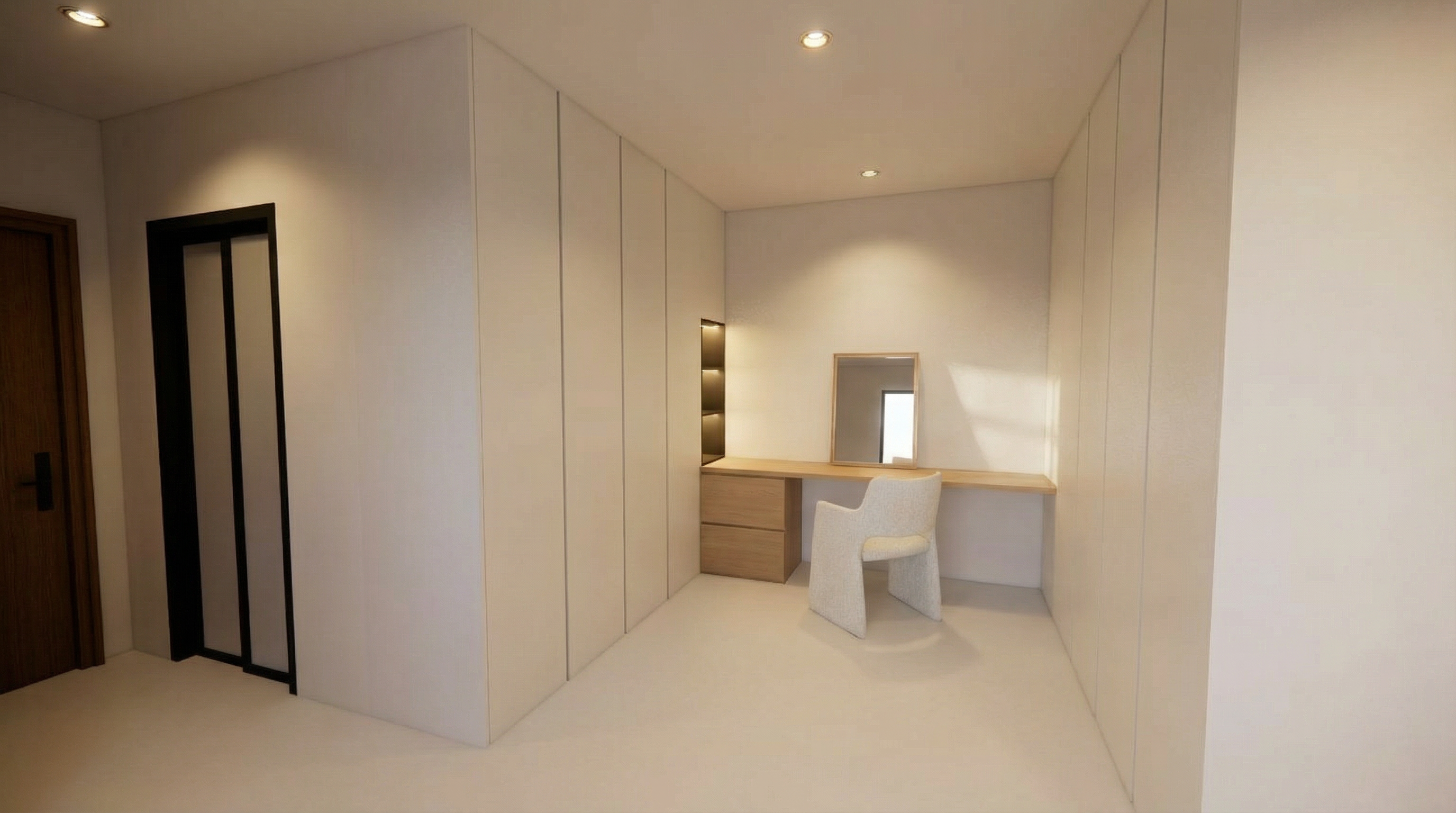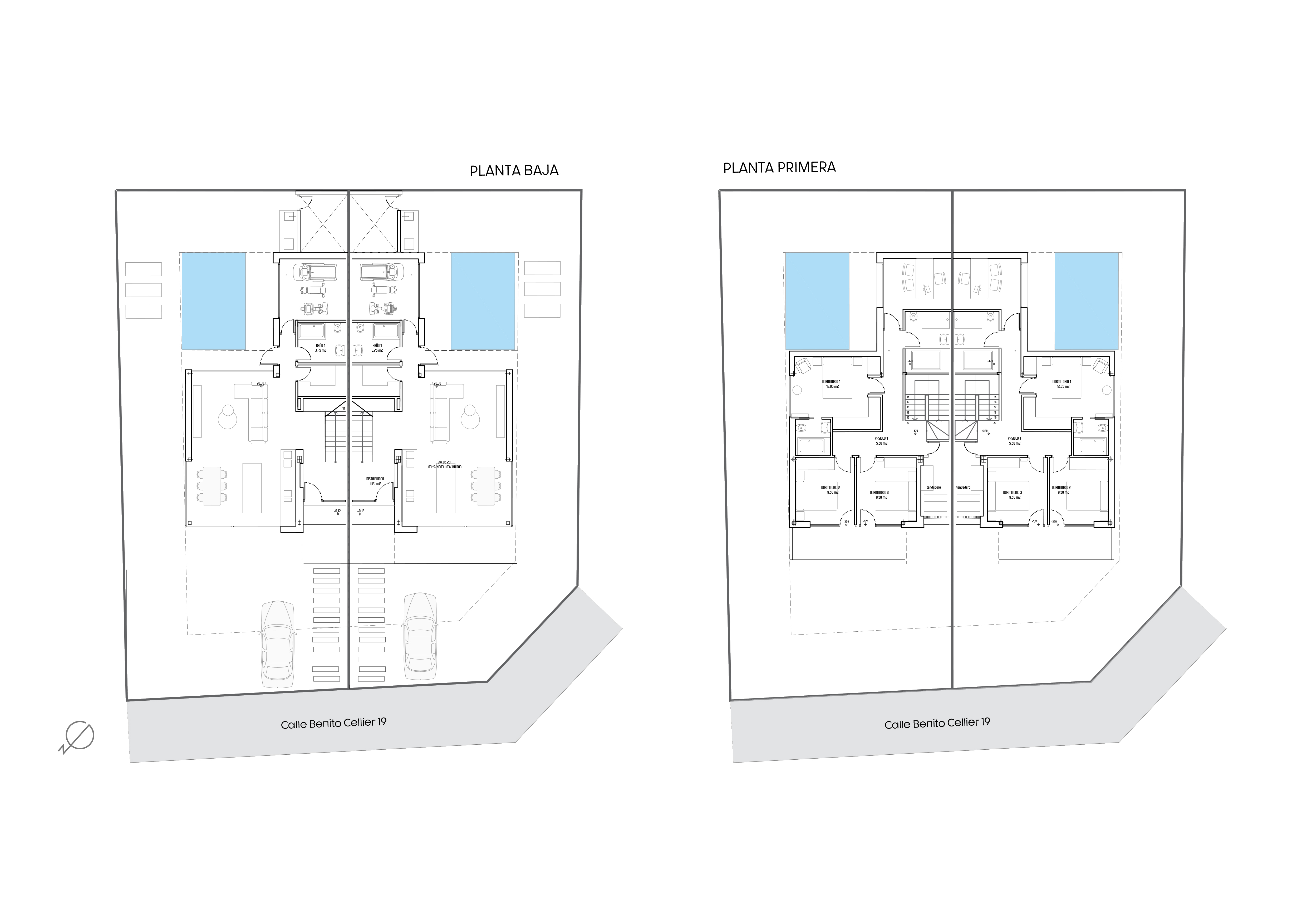 modern architectural floor plan sleek and aesthetic design soft white walls elegant grey lines bright blue pools lush greenery around the building warm sunlight and subtle shadows create an inviting and serene atmosphere