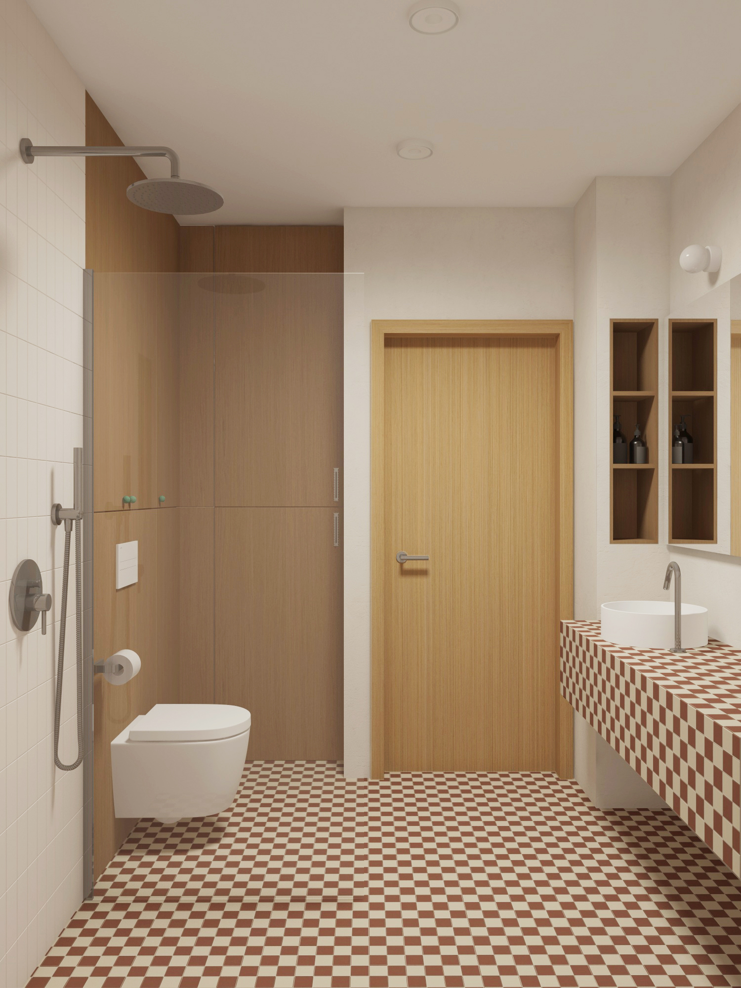 do not modify the original model geometry proportions layout structure or placement of any elements keep the exact same architecture forms and design do not alter or redesign any objects in the scene only improve the materials textures and surface details to achieve a significantly more realistic result enhance material accuracy using physically correct textures proper roughness values reflections bump normal maps and subtle surface imperfections maintain the original material intent while improving realism the scene is illuminated by ceiling lighting the lighting should feel natural and believable with realistic light intensity soft shadows accurate reflections and balanced exposure improve global illumination and realistic light interaction with all materials focus on high end photorealism through refined material definition realistic reflections subtle imperfections and natural color grading without changing the model geometry layout or design in any way colour balans is neutral the tile colour is beige do not change coulour balance scene is iluminated by two ceiling spots