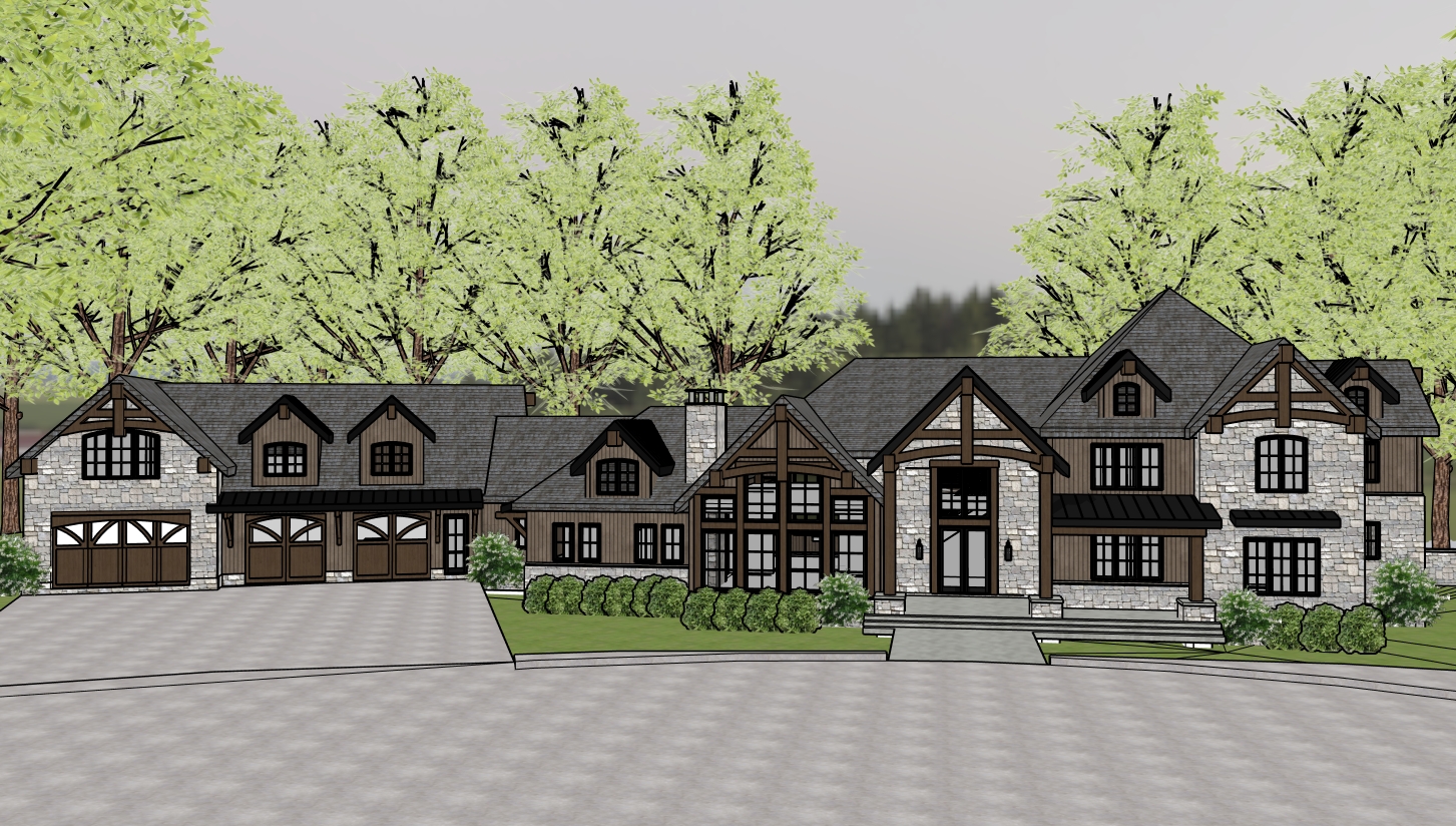 modern farmhouse in the woods vertical wood siding with stone facade slate roof governors drive with grass yard and rustic landscape with shrubs trees bright sunny sky with the sun shining through