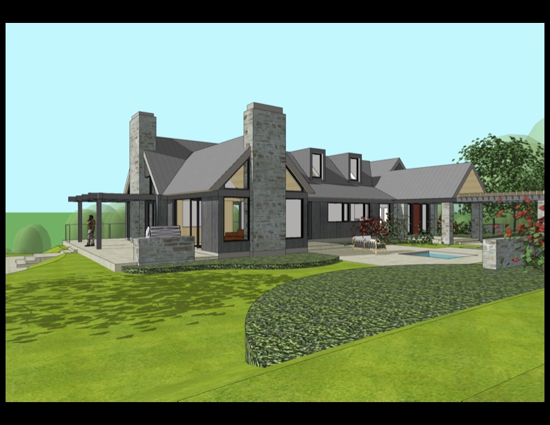 dark grey wood siding and land falls away in background