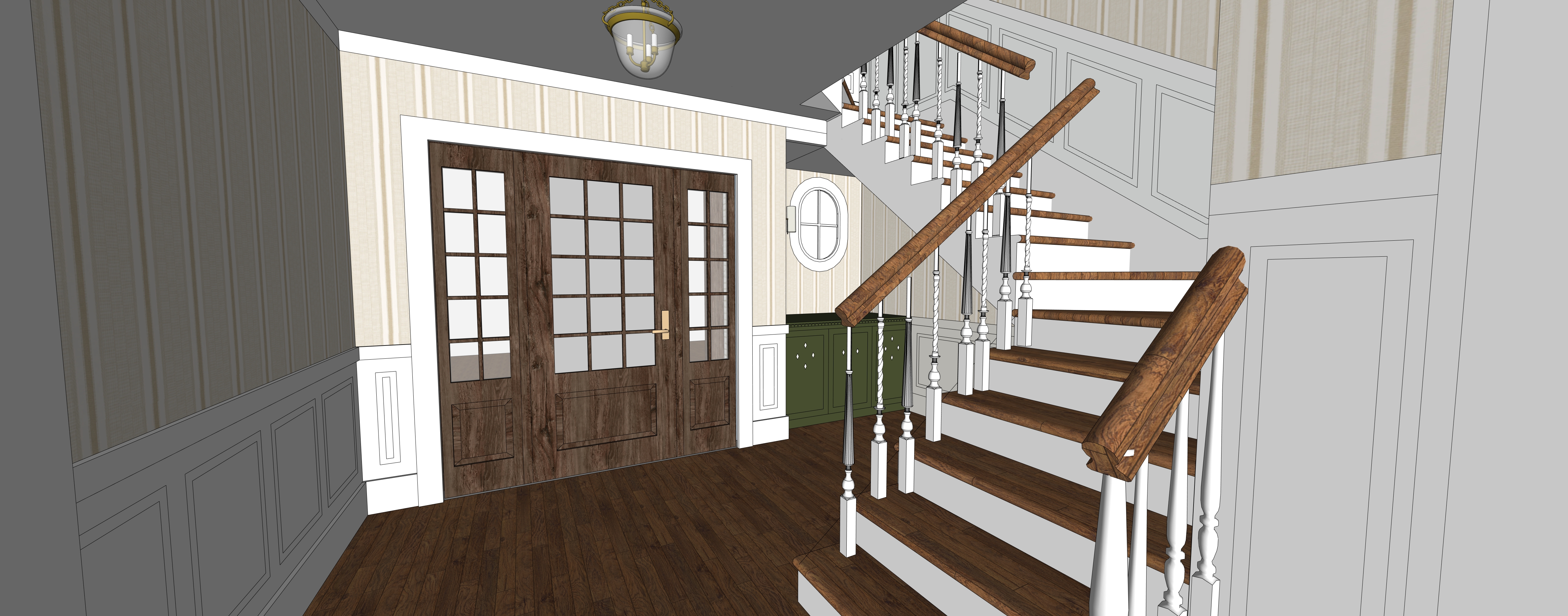 create a highly photorealistic interior rendering of a traditional residential foyer with a staircase using the provided reference image maintain the exact architecture layout stair geometry railing design doors paneling and proportions shown in the model do not alter the design or placement of elements architectural style classic american traditional foyer with refined millwork and warm natural materials key elements to preserve dark stained hardwood flooring with natural plank variation solid wood french doors with divided glass panes and warm walnut stain painted white door trim and baseboards staircase with stained wood treads and handrails painted white risers and balusters traditional alternating barley twist and fluted balusters paneled wall molding along the staircase vertical striped wallpaper in soft neutral tones above wainscoting painted wainscoting in a muted olive green tone beneath the stair round window beside the stair traditional flush mount ceiling light fixture material realism natural wood grain and subtle color variation on doors flooring and stair treads slight sheen on finished wood surfaces crisp painted trim with soft satin finish subtle wallpaper texture and fabric like depth accurate reflections in the glass door panes soft shadowing between balusters and stair treads lighting natural daylight entering through the glass french doors soft ambient interior lighting from the ceiling fixture warm natural light bounce throughout the foyer balanced highlights and shadows like professional interior photography camera settings eye level perspective 5 ft height 28 35mm architectural interior lens wide but natural perspective high dynamic range ultra high resolution 4k 8k rendering style professional architectural photography realistic balanced and natural the final image should look like a luxury custom home builder portfolio photograph not stylized cgi
