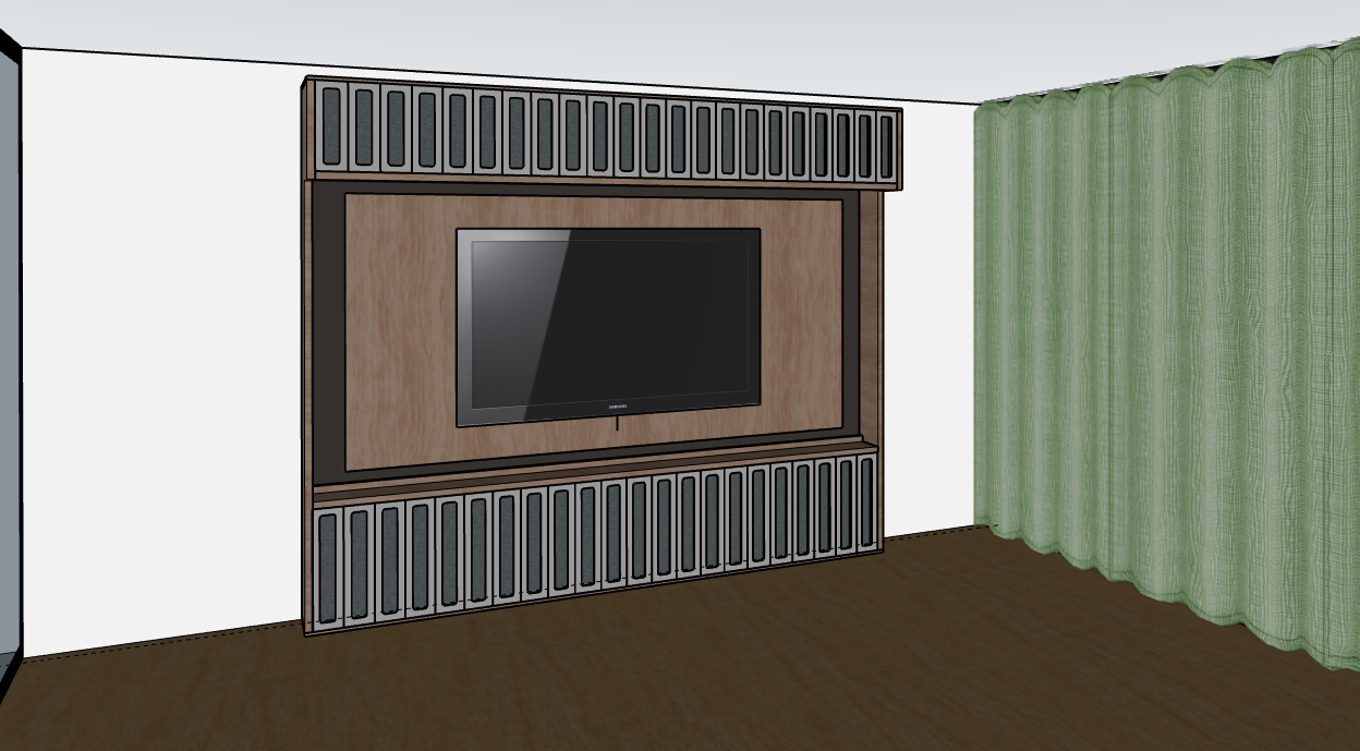 a modern living room with a sleek entertainment center the wall mounted flat screen tv is framed by a panel of rich walnut wood the speaker sections have a metallic silver tone creating a contrast with the wood the floor is a deep mahogany color adding warmth to the room the curtain on the right is a soft muted sage green bringing a fresh natural element to the space the walls are painted a crisp white enhancing the room s brightness the atmosphere is contemporary and cozy with a perfect blend of warm and cool tones architecture