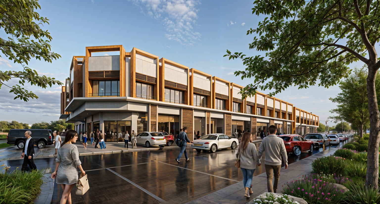 modernist exterior shot create a photorealistic rendering of a modern two story building the upper section features a white facade with large windows accent the windows with light wooden frames the lower section is a sleek dark gray include a balcony with black railings trees surround the building displaying lush green foliage the ground is covered in light green grass dotted with various circular patterns representing plants add a soft clear sky above evoking a tranquil sunny day atmosphere architecture