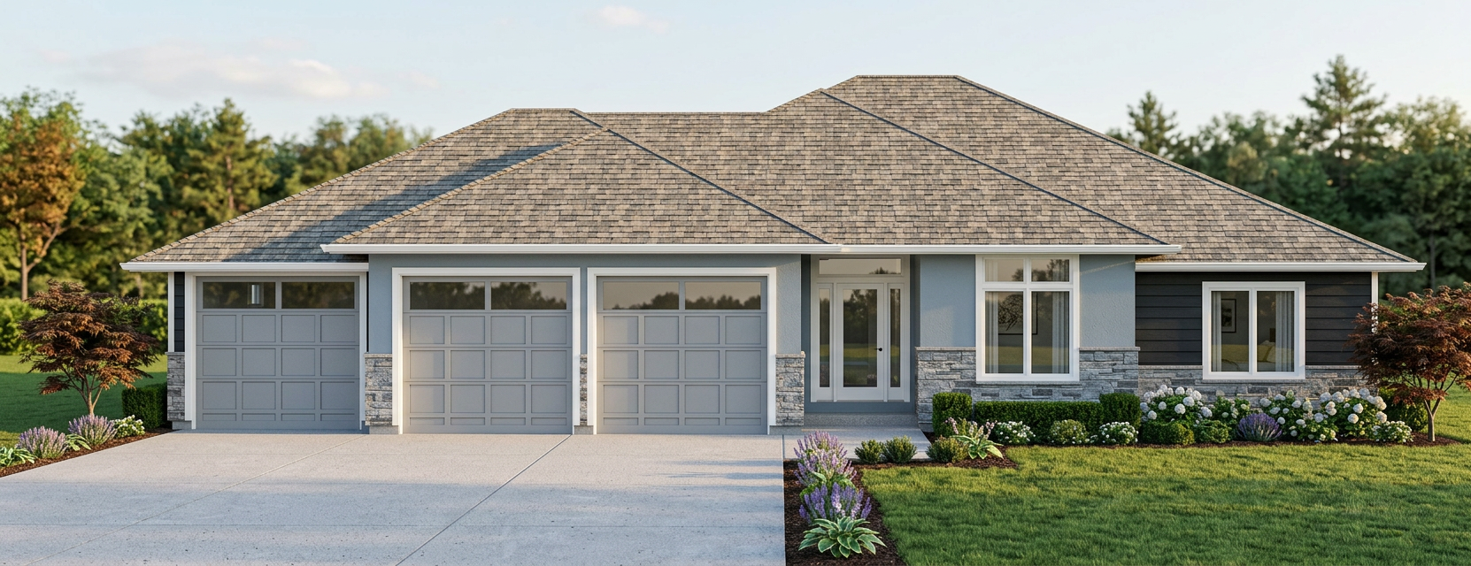 add trees in the background in an evening setting garage doors in white add eave pot lighting
