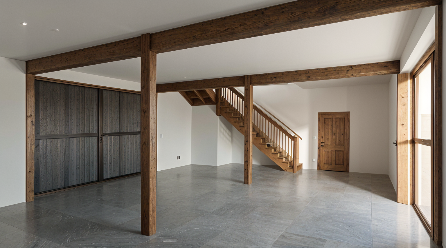 evening lit inside wide plank white oak wood floors inside venetian plaster walls inside