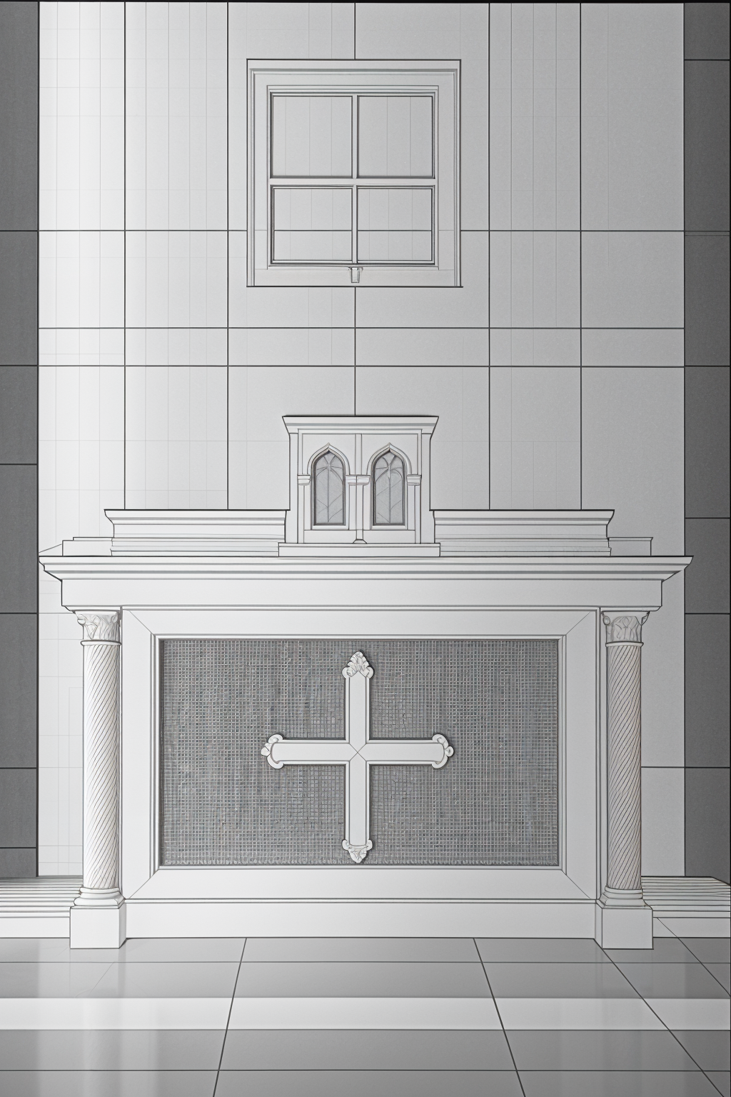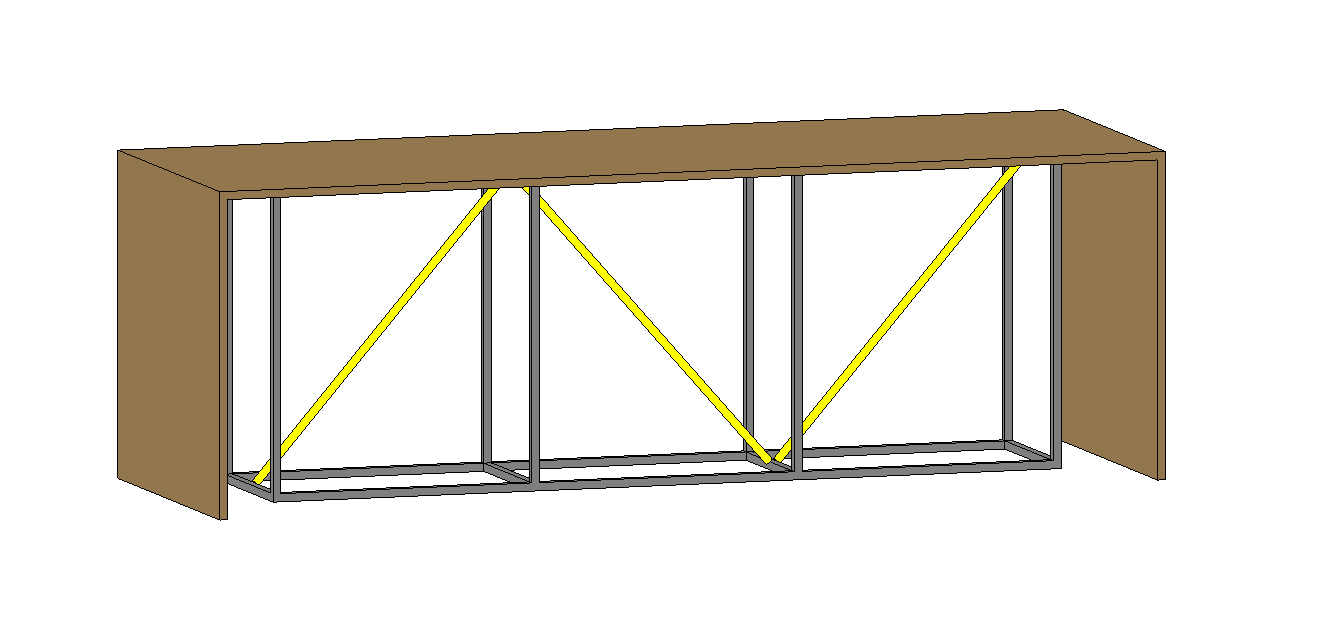 render this table keep the colours the top should be osb the legs and bracing should be solid pine painted yellow the background should be a plain background architecture
