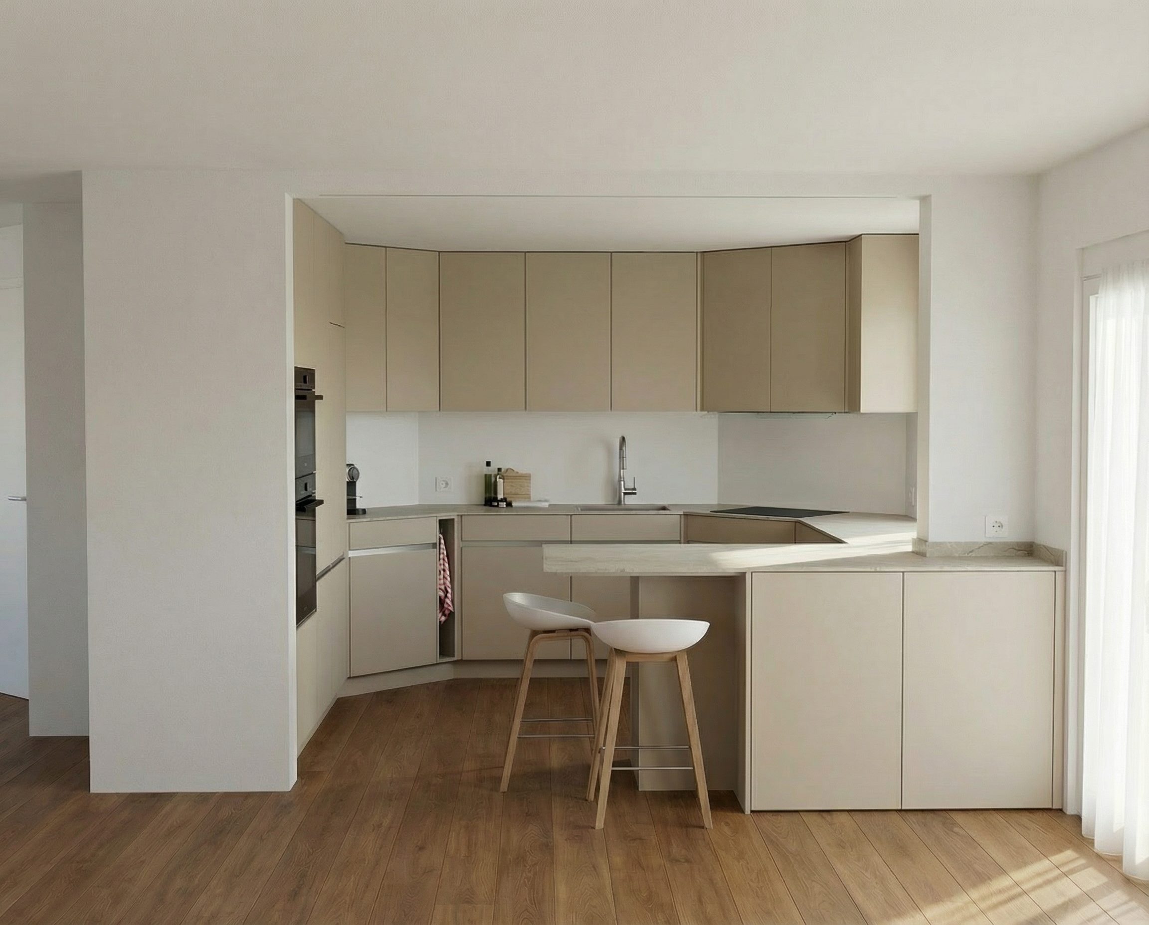 photorealistic canon eos 5d minimalistic service apartment with retail at ground level facade design black tinted curtain glazing on off white and black frame geometric shaped outline archdaily style dramatic lighting effects motion blurring people walking award winning wet road car tail lightings