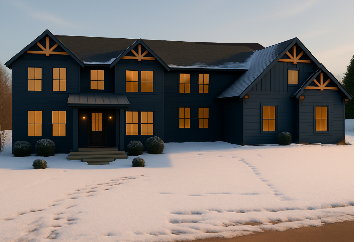 exterior shot remove the footprints in the snow make the wooden decorations at the peaks much smaller dark blue siding