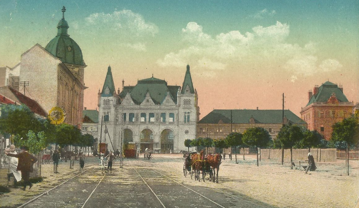 sunny day 1900 s style atmosphere beautyful clouds emove text from top of the picture paved surface aligned to the tram track shiny tramtrack cinematic hyperrealistic render