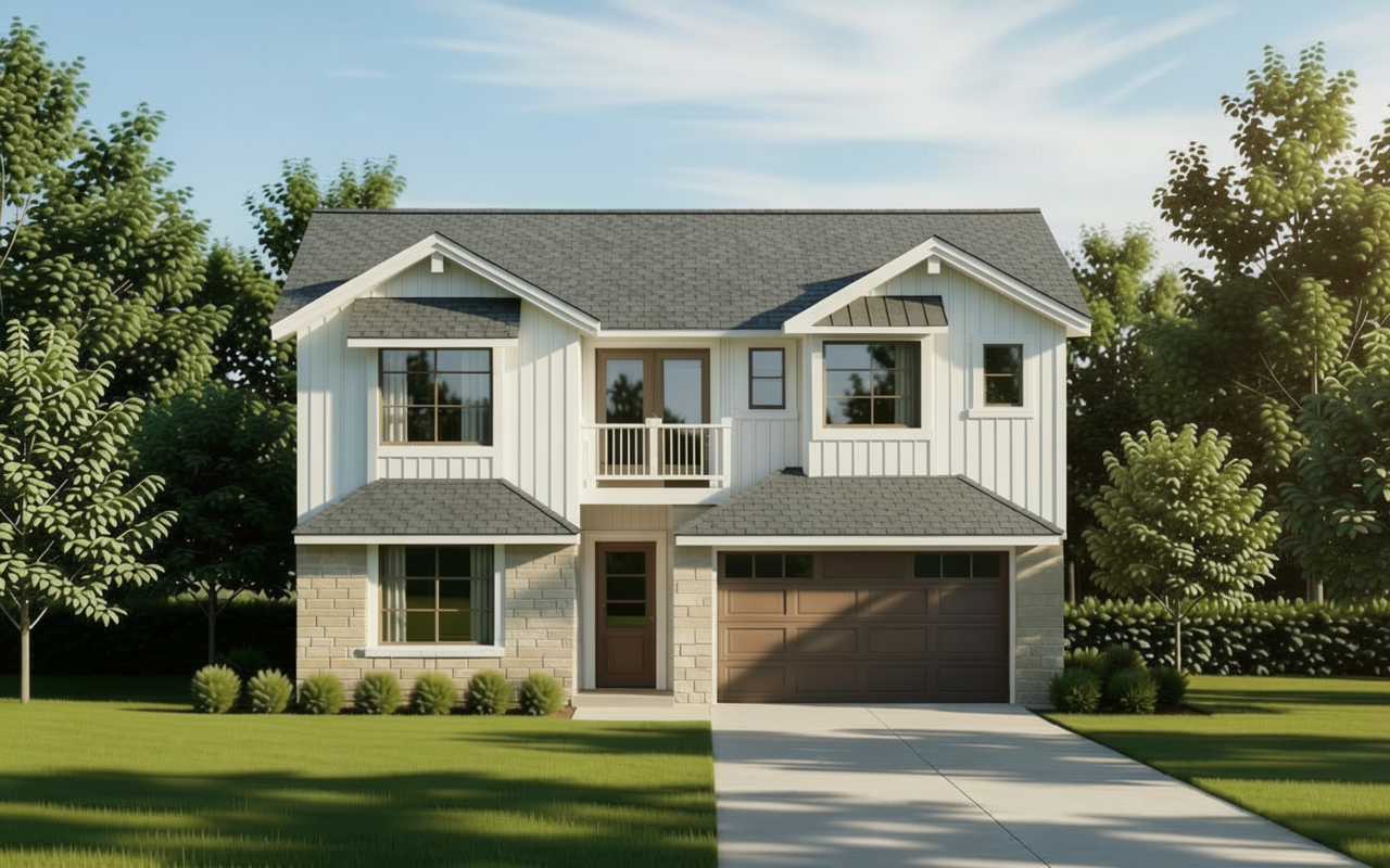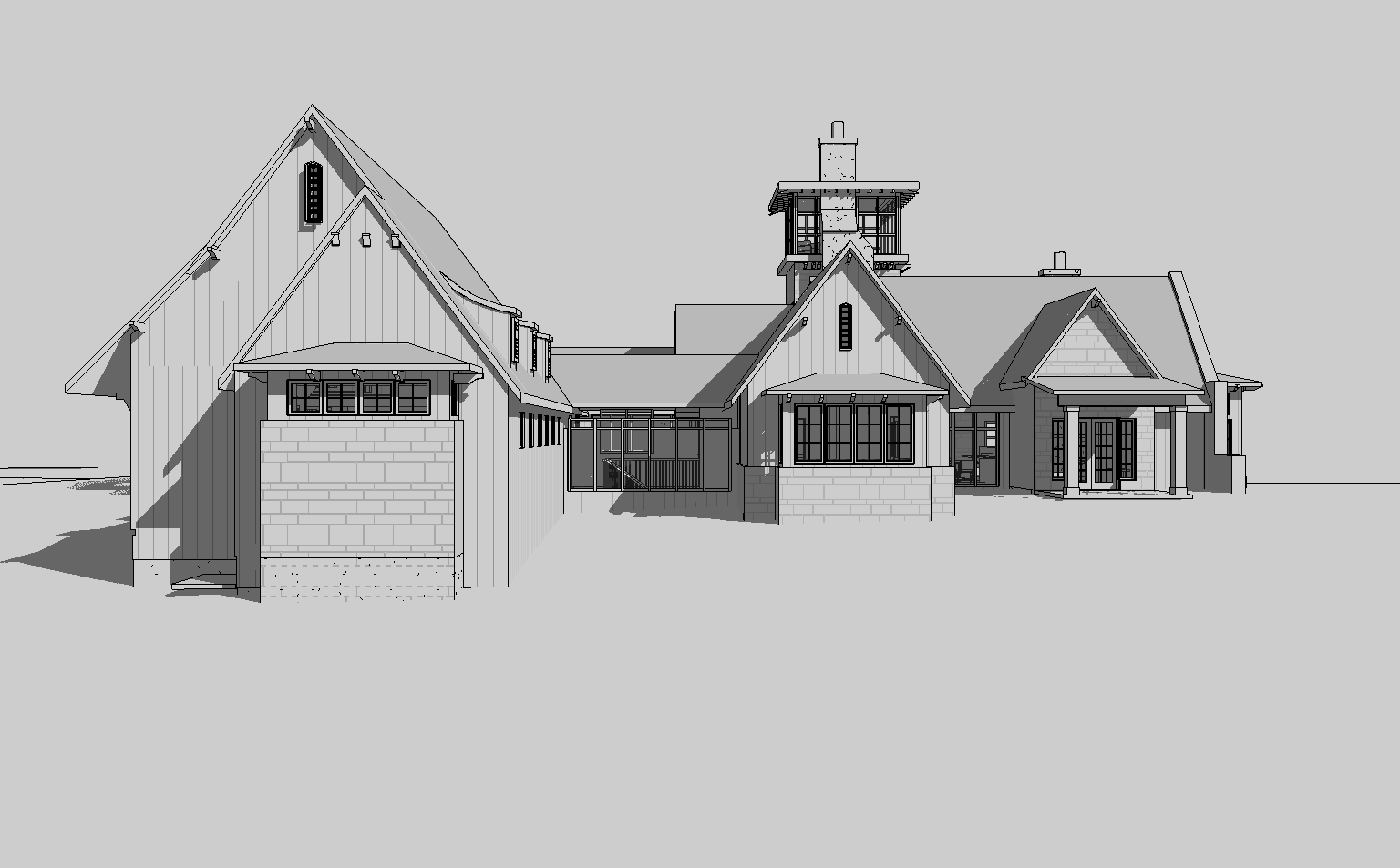 modern farmhouse rustic stone gables vertical wood siding stone tower tall grass foreground trees in background