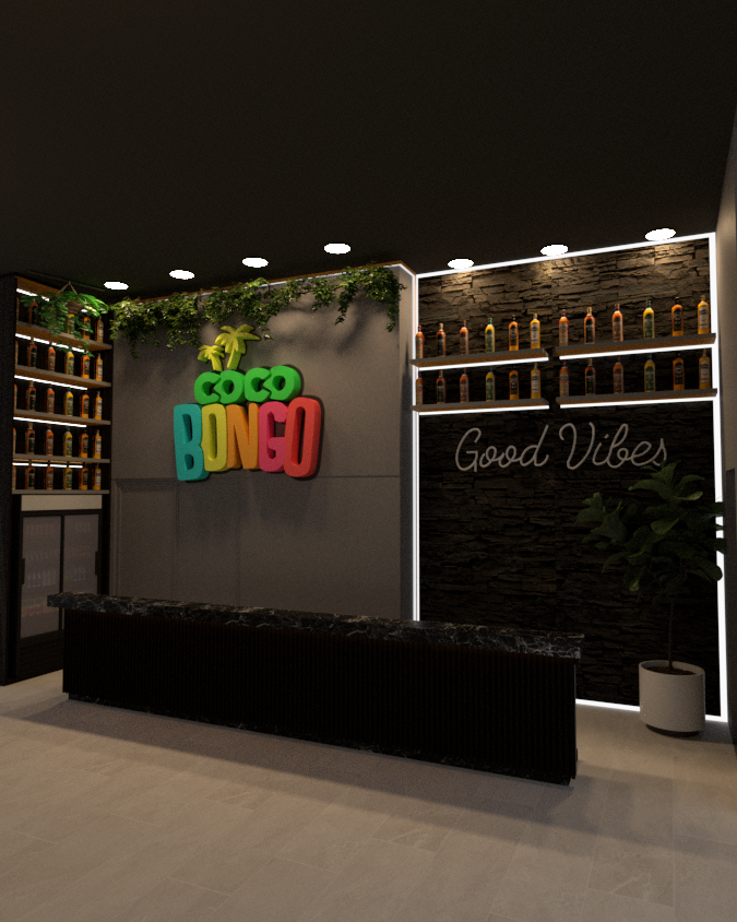 colorful beverage bar with vibrant colors and neon lights display fridge under shelves green plants rainbow led under bar counter