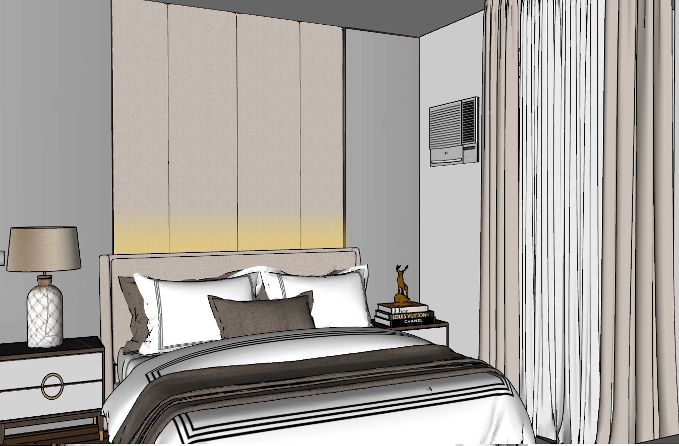 render as is then put floor to ceiling mirror behind the two side table with light above head board