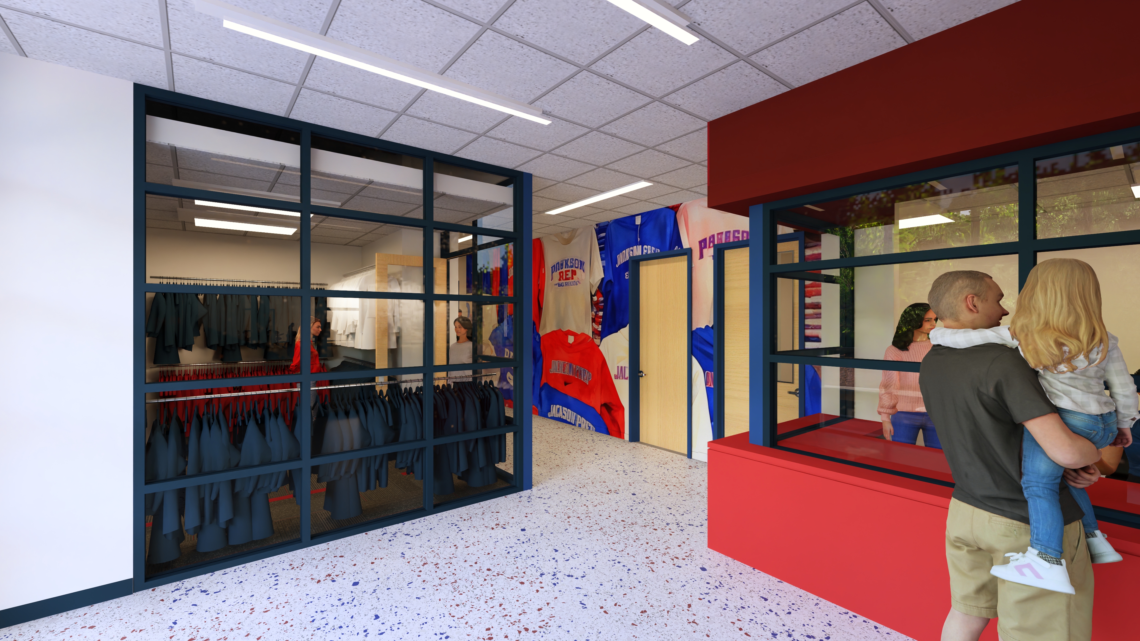 add kindergarten children in casual blue school uniforms coming out down hall after buying new school swag