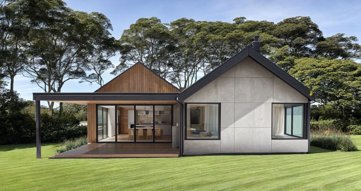 turn this into an organic modern barn home soft muted green shrubs and grass light natural stone cladding and black window frames architecture