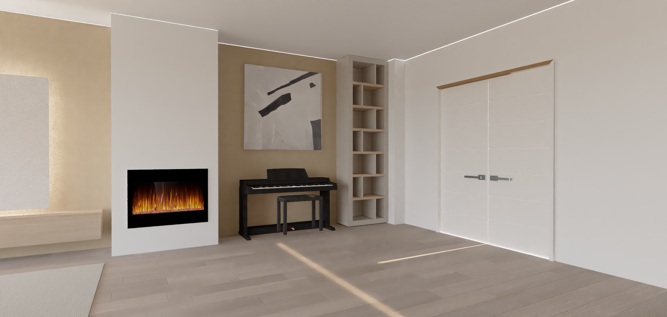 necesito una imagen fotorealista ilumnacion natural entrando desde la izquierda elimina el ruido a ade unos focos peque itos empotrados en el tehco iluminando el piano y a ade libros en la libreria que hay al lado del piano