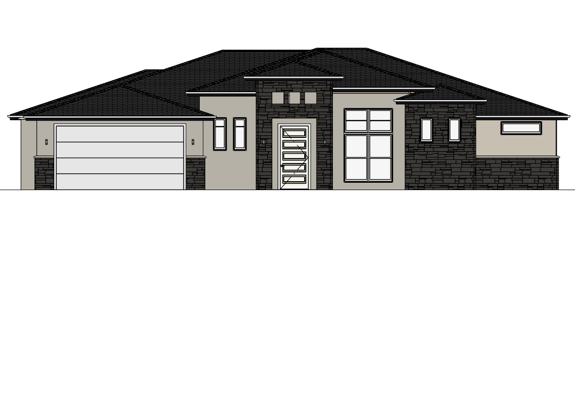 render the architectural elevation in a soft minimalist watercolor sketch style use warm desaturated beige and cream tones paired with thin clean black linework for windows edges and architectural details incorporate subtle pencil like edge strokes and delicate shading to maintain an artistic hand drawn feel surround the building with loose airy botanical elements lightly sketched trees and shrubs in muted greens and browns with a semi transparent hand painted quality maintain a bright white background with low contrast for a calm natural aesthetic the exterior materials should be clearly represented light white stucco as the main finish and stacked stone veneer as an accent material keep the textures soft and watercolor like while preserving architectural precision match the lighting tones and overall mood of the reference image the final look should be elegant modern and artistic blending architectural accuracy with gentle illustration textures