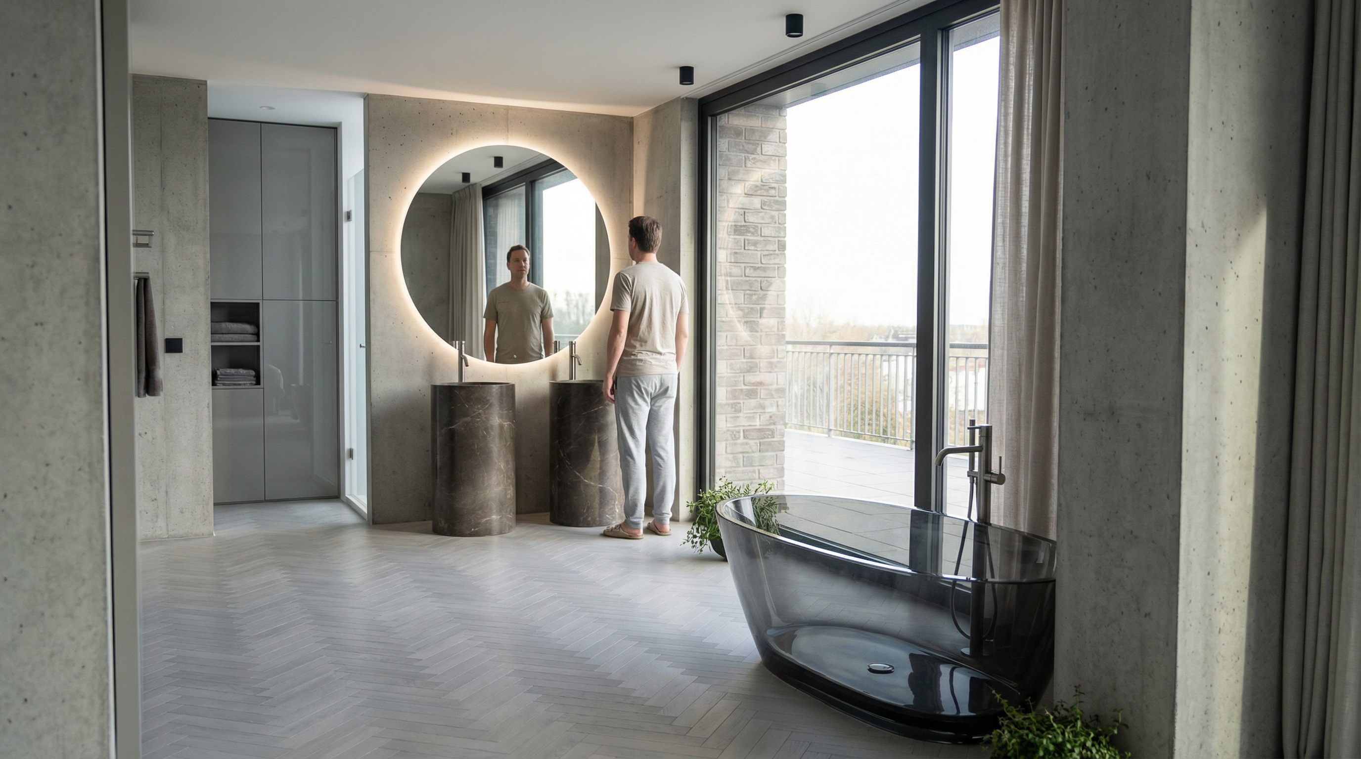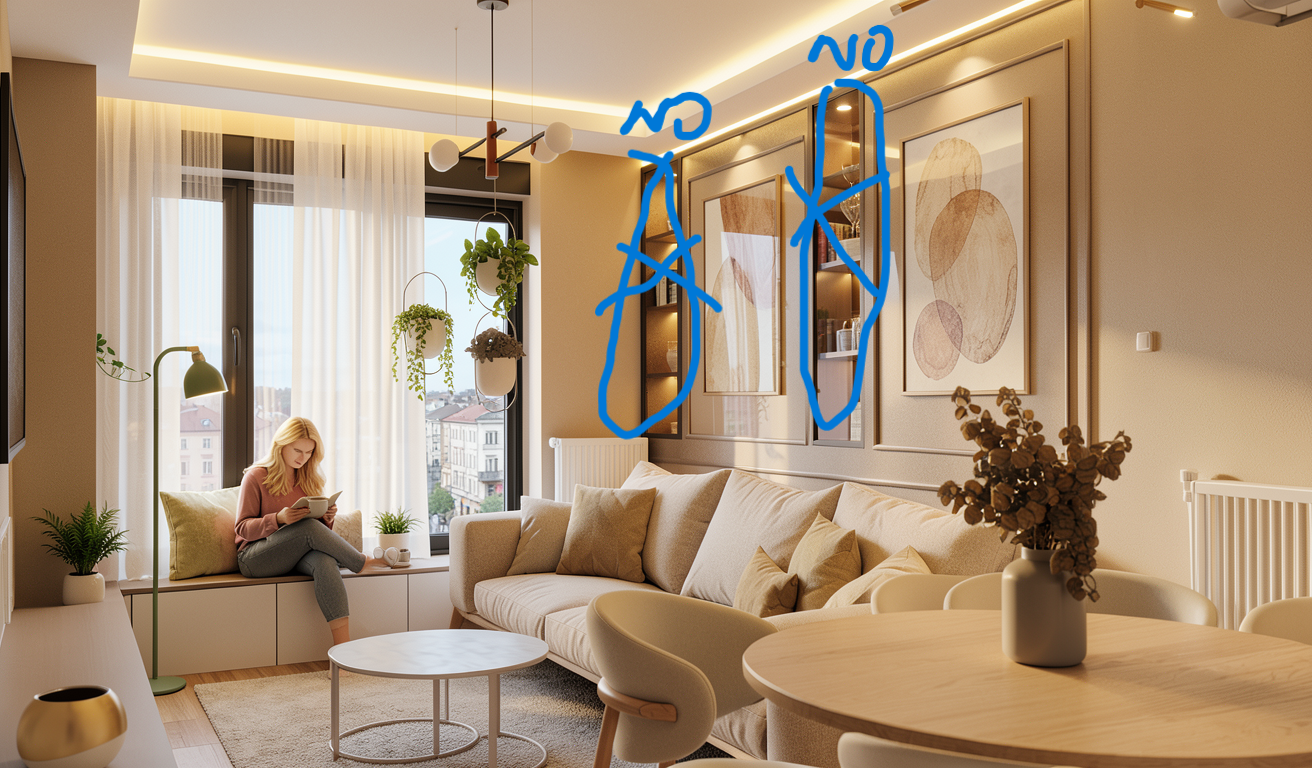 led lighting in the lowered section of the ceiling emits light inward there is also led lighting under the upper kitchen cabinets as well as inside the cabinet with glass doors the glass doors have a black frame with transparent bronze tinted glass the colors are warm and soft and the entire space conveys a sense of homely warmth the view from the window looks out onto the buildings across the street the apartment is located in the vo dovac area of belgrade on the second floor add a blonde slim short girl sitting on the window bench getting ready to read a book while having coffee the curtains consist of a non transparent layer without color and a sheer white layer the colors off furniture and walls are beige sand cashmere everything is light and cozy in the frames upside sofa are paintings like in the sketch floor lamp is green and dining table is light oak no shelves upside sofa just paintings