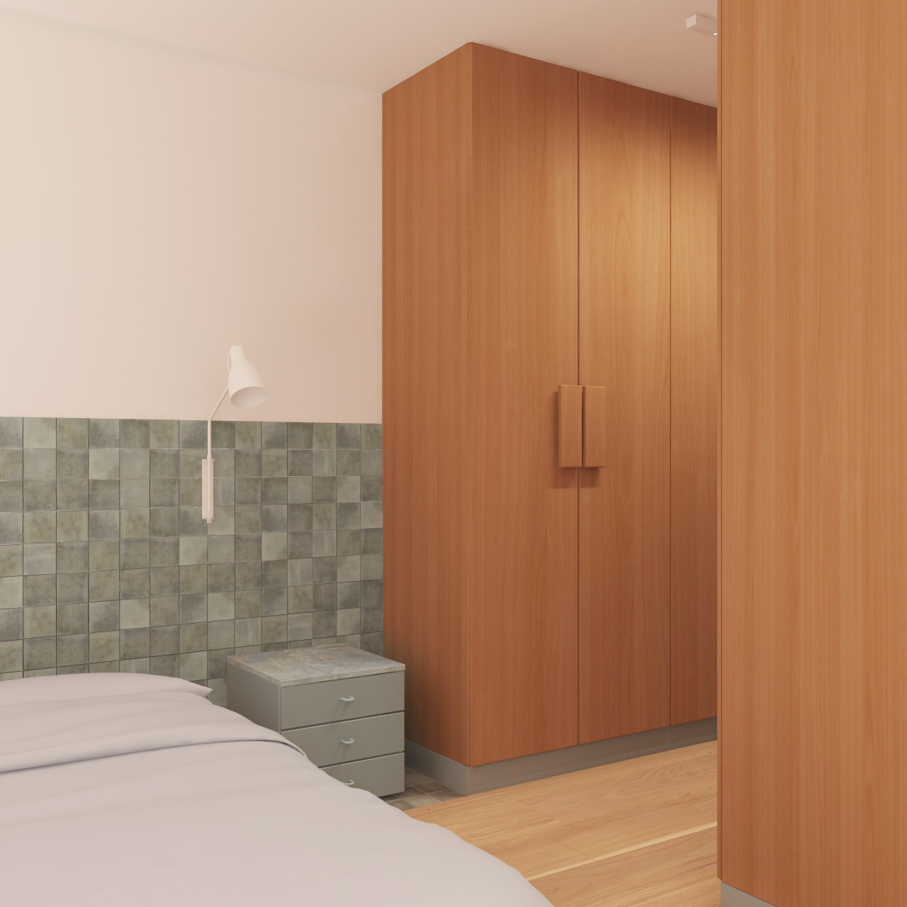 do not modify the original model geometry proportions layout or structure in any way keep the exact same architecture and forms only improve the materials textures and surface details to make the visualization significantly more realistic enhance material accuracy physically correct textures proper roughness reflections bump normal maps and refine surface imperfections for a natural look use warm natural lighting golden hour tone to create a cozy and inviting atmosphere improve global illumination realistic shadows soft light diffusion and accurate light interaction with materials focus on achieving high end photorealism through better material definition subtle imperfections realistic reflections and natural color balance without altering the shape scale or design of the building the wardrobe is iluminated by artificial light