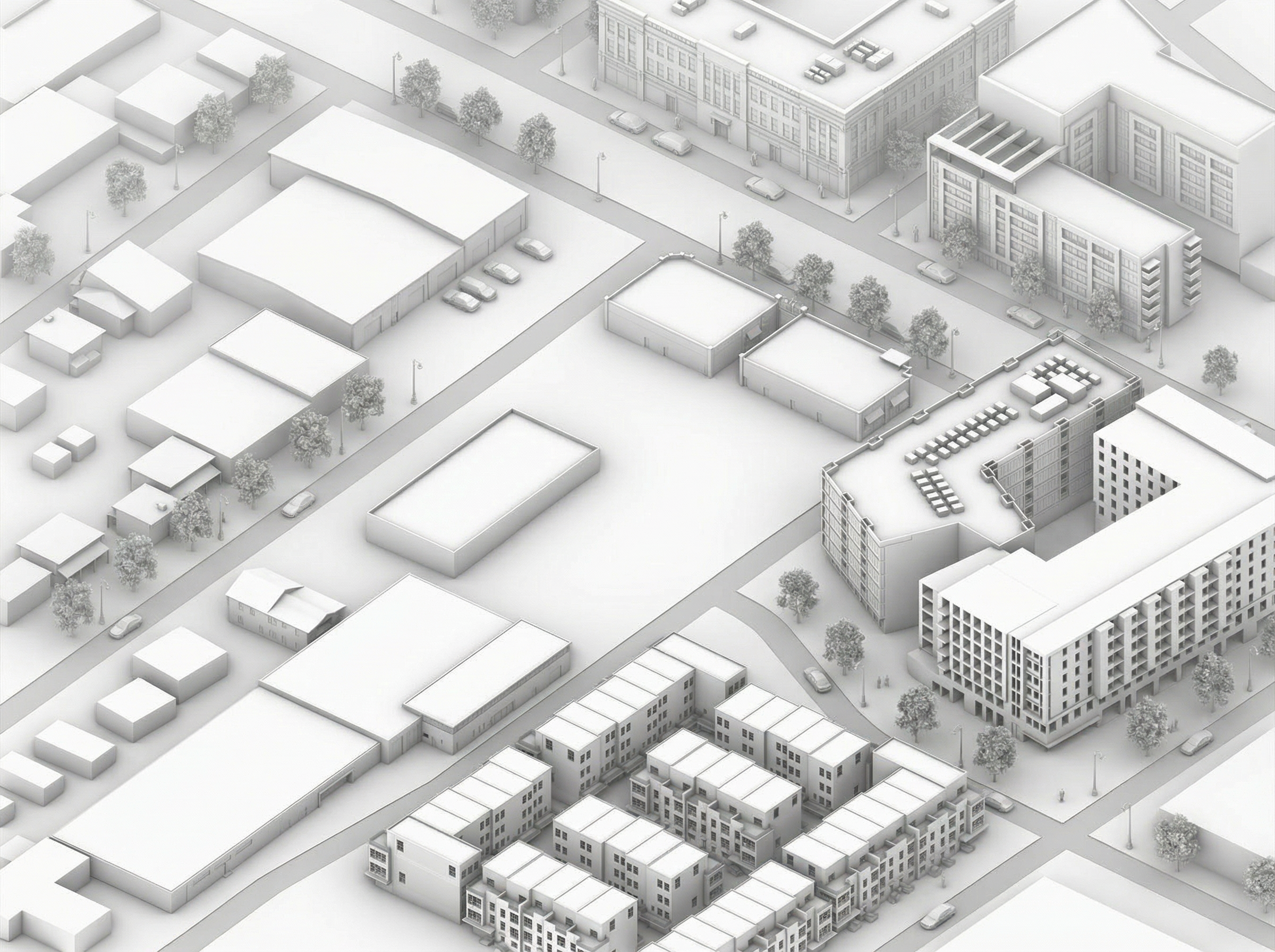 use the original starter image do not add atmospheric fog haze bloom or softening effects keep the image crisp sharp and clean like a high quality clay model with strong clarity do not change camera angle building massing or site boundaries correct the urban context details move all street trees so they align correctly along sidewalks and landscape strips never in the roadway add accurate rooftop hvac units vents and mechanical equipment to the flat roofs of commercial and multifamily buildings keep all rooftop equipment monochrome white light gray fully matching the clay model style road and pavement correction make road surfaces a uniform medium gray tone to distinguish them from sidewalks and building parcels keep sidewalks open lots and rooftops a lighter tone add subtle curb line definition with crisp shading but no textures clay model style refinement maintain sharp edges and high clarity no blur no glow no volumetric effects keep all details monochrome white light gray with soft ambient occlusion only in creases keep cars and street lamps where realistic but ensure none are floating or incorrectly placed no people no additional atmosphere important do not add any objects or details inside the central blank development lot do not modify architecture beyond adding rooftop mechanical equipment output should be a crisp clean high resolution clay render site axon retaining full detail and edge sharpness
