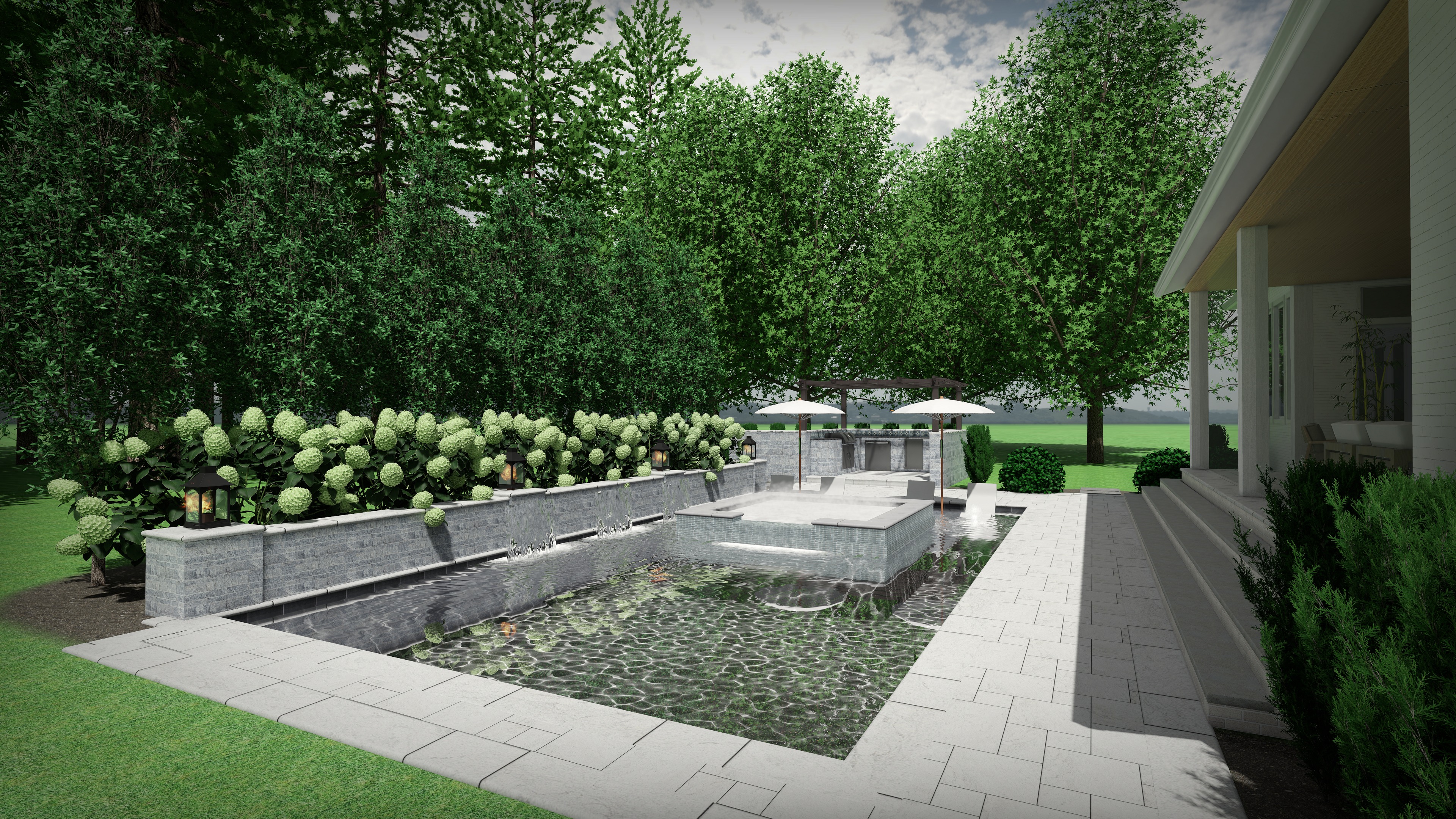 make it look like its a real photo wall material is tdh ocean splitface stone the spa tile is navajo gray 1x2 and the pool deck is marmiro deep blue marlbe in french pattern