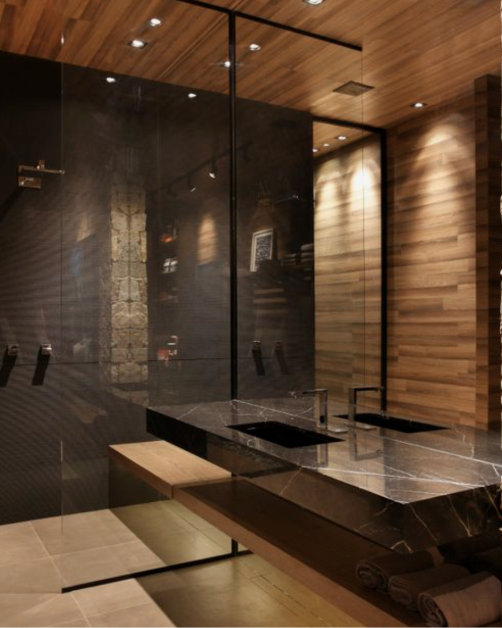 create a serene and luxurious bathroom scene based on the given layout the room dimensions are narrow approximately 11 x 6 design a modern japanese scandinavian bathroom from the pov of the entry on the right is the toilet followed by a minimalist walnut wood floating vanity with a sink sunk into it on either side of the mirror and handblown glass light fixtures in front of the viewer on the back wall is a fully enclosed shower area a dark green tiled spa steam shower the doors to the shower slide and seal to hold in steam on the left opposite the vanity include a dark brown stone freestanding oval bathtub on the left that sits directly on the floor include two small windows on the left above the tub that allow direct sunlight in use a color palette of neutral tones charcoal wood stone for a zen calming effect with matte brass fixtures the atmosphere should be peaceful and spa like inviting relaxation and tranquility no plants add dark walnut herringbone flooring try some new materials like sugi ban charred wood make it more rustic looking now make it narrower darker sexier and moodier keep everything the same and only change the windows to be larger but leave the windows in the same place above the tub change the green tile to earth colored plaster walls
