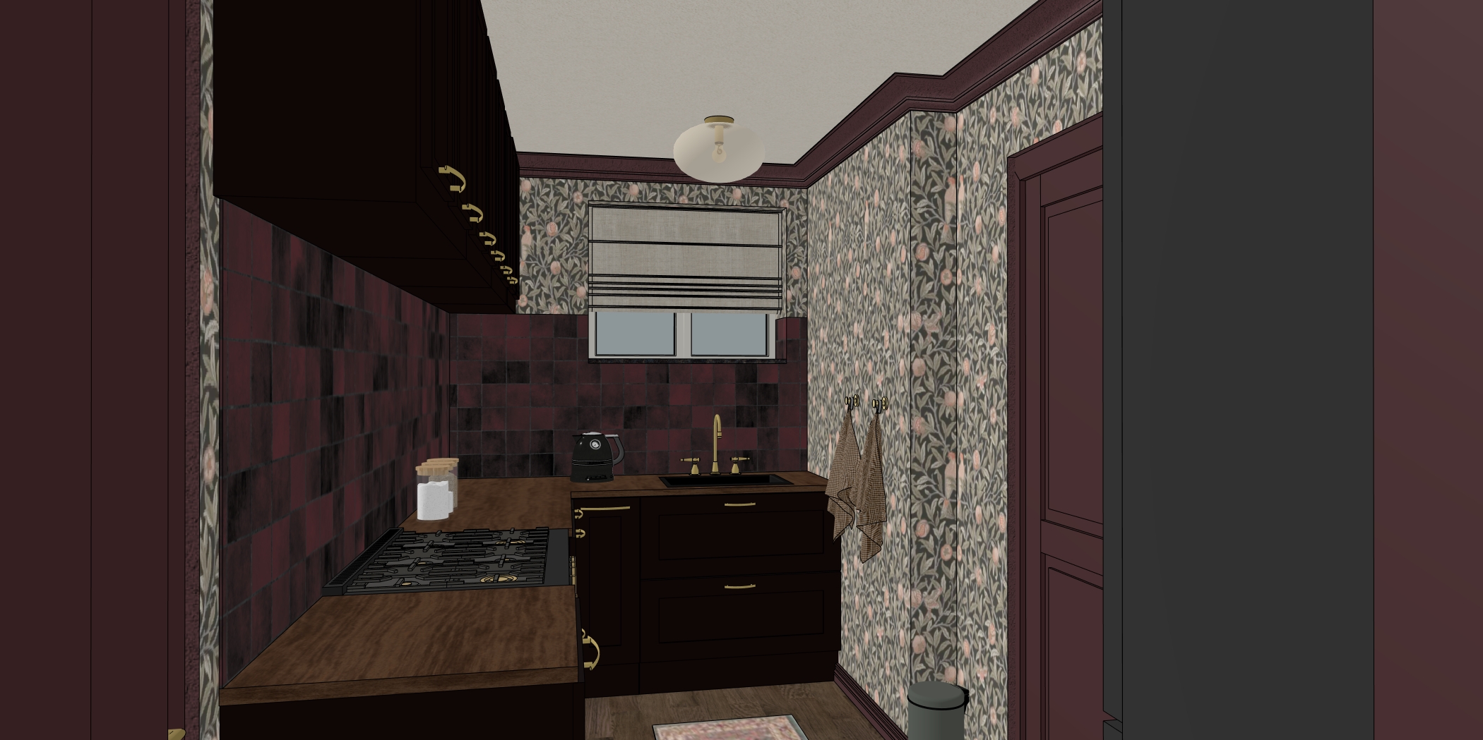 the doors are purle burgundy the cabinets black wood countertop dark wood