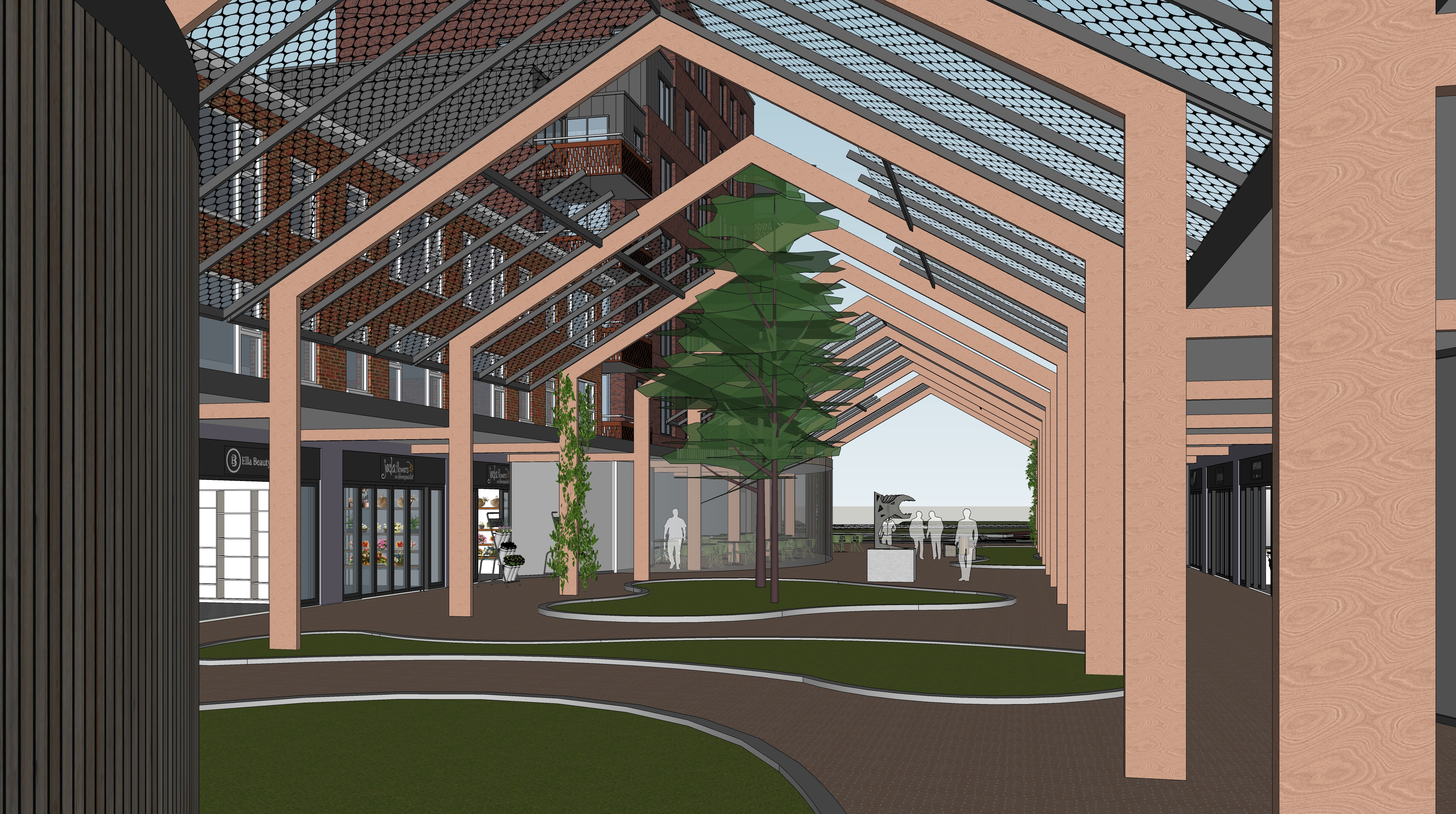 render a stunning architectural visualization of a covered walkway with large tree columns the support beams are made of light natural wood blending with a mesh roof that lets in soft diffused sunlight the atmosphere is serene and modern with a touch of nature the ground is covered in a rich earthy brown contrasted with lush green patches interspersed throughout include subtle shading to enhance depth and a clear blue sky to evoke a refreshing ambiance the surrounding buildings are a mix of warm reds and browns with large glass windows people are subtly positioned to add life with their forms reflecting a calm and leisurely pace