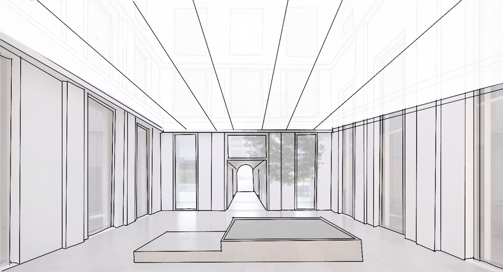 generate an hand sketch drawing from this image i black and white tick black pencil only no shadows no trees and add few persons