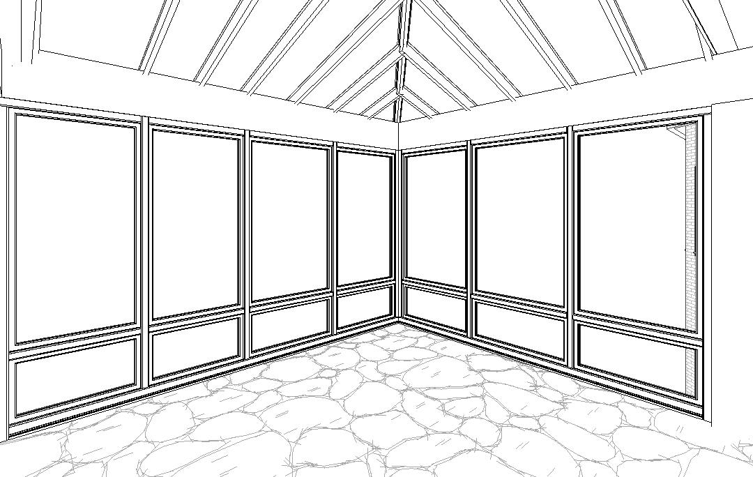 render interior shot a of tudor style home with dark heavy timber elements brick facade and slate roof a single cream colored stucco wall trimmed with dark brown wood complements the beige colored brick a glass conservatory sits on top of the deck with glass reflecting the lush landscape and sky a golden hour sun baths the scene in warm golden rays a lush lawn with ornamental shrubs creates a perimeter around the lower level paver patio