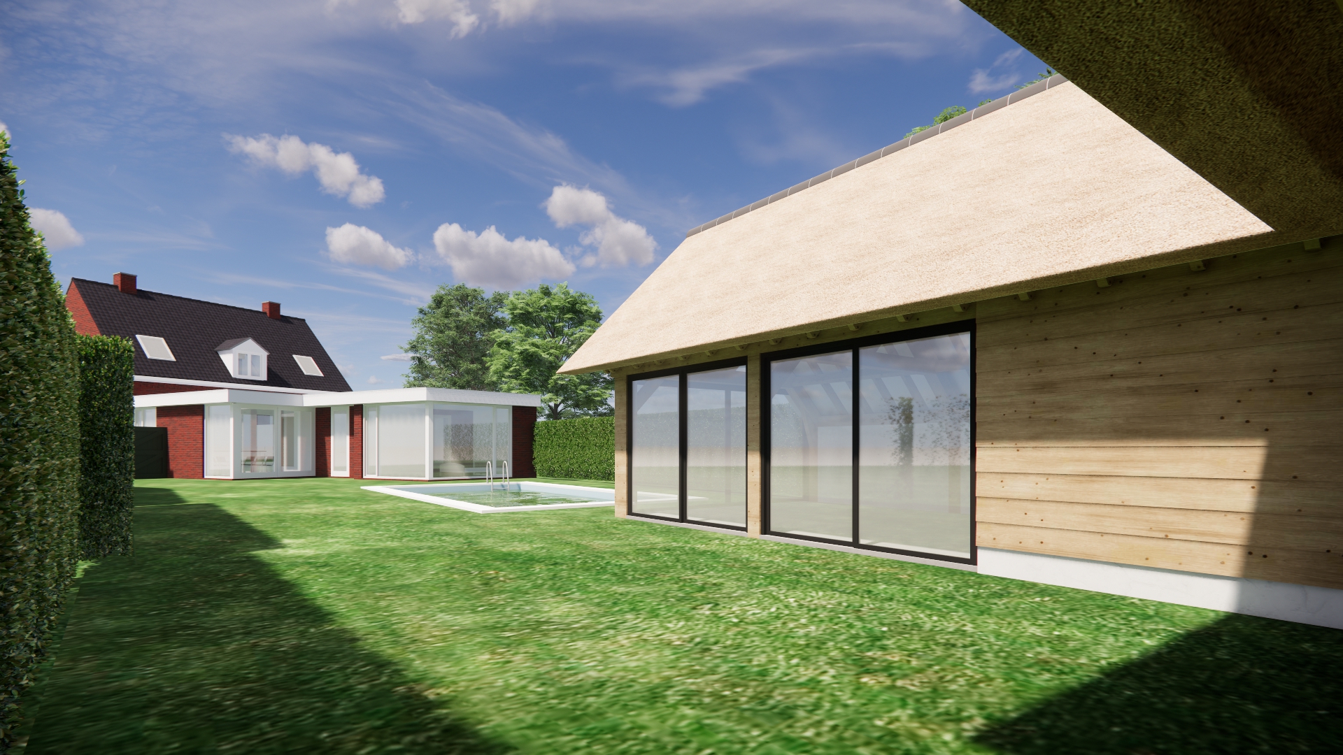 maak deze bestaande architectonische render fotorealistisch verbeter het gras en de begroeiing zodat deze natuurlijk en gevarieerd oogt met realistische texturen diepte imperfecties en subtiele kleurvariaties verbeter het glas door realistische reflecties en lichtbreking toe te voegen met een natuurlijke balans tussen spiegeling en inzicht naar binnen waarbij het interieur zichtbaar blijft inclusief realistische gordijnen binnenverlichting en interieurdetails maak de dakpakkansen realistischer als een vlakke keramische antracietkleurige dakpan met gevelpannen en in lijn met hoe ze doorgaans in nederland worden uitgevoerd correcte verhoudingen geloofwaardige detaillering materiaalafwerking en aansluiting op het dak maak het rieten dak realistischer in lijn met hoe ze doorgaans in nederland worden uitgevoerd correcte verhoudingen geloofwaardige detaillering materiaalafwerking en aansluiting op het dak behoud exact de bestaande verhoudingen afmetingen camerahoek en compositie behoud de huidige materialen en kleuren maar verfijn ze subtiel zodat ze natuurgetrouwer ogen realistische ruwheid reflectie veroudering en detailniveau verhoog de algehele lichtbalans schaduwwerking en materiaaldefinitie voor een hoogwaardige architectuurvisualisatie met een fotografische uitstraling upscale de afbeelding naar 4k resolutie met scherpe details en zonder artefacten stijl fotorealistisch high end architectural visualization natural lighting real world materials dutch residential context