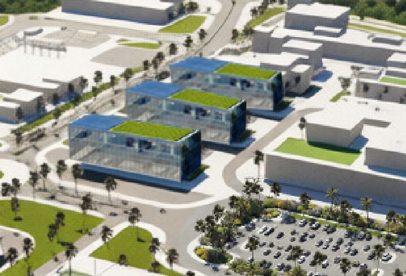 contemporary office buildings glass facade and keep green roofs