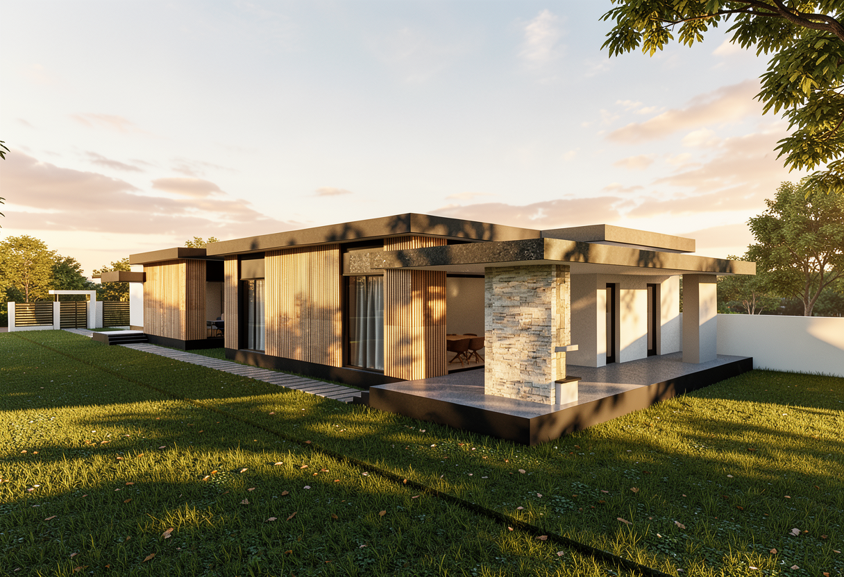 industrial building corten steel and concrete panels vertical dark shiplap river with dam foreground trees in background fog dusk soft interior lighting