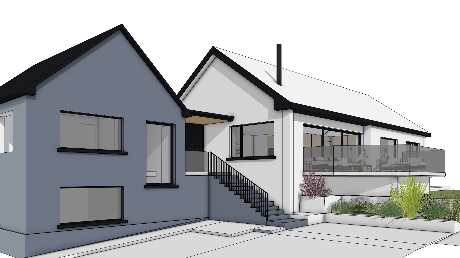 modern exterior shot leave the navy blue grey render on the building on the left the building on the right is an off white greenery to the right architecture