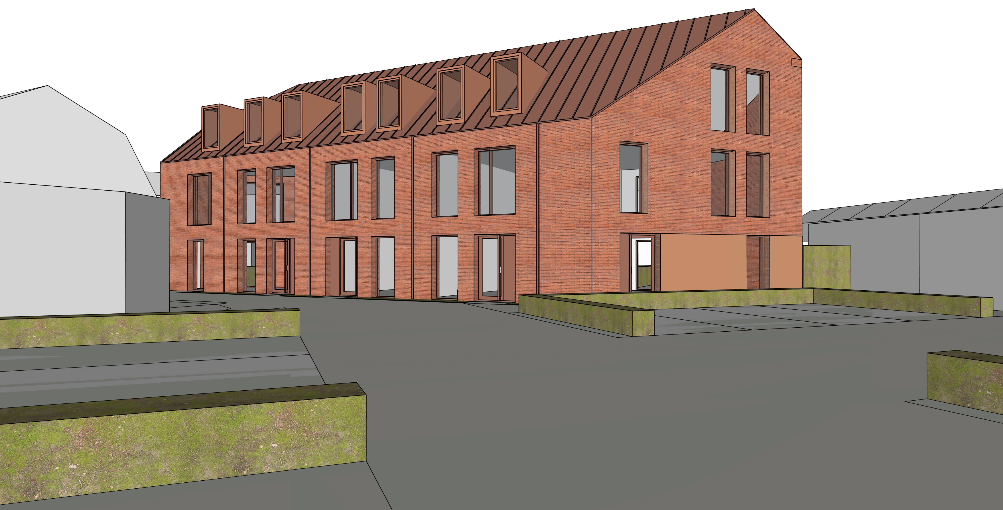 create a warm and inviting residential scene inspired by contemporary dutch architecture the main buildings should feature facades made of red brown mottled brick with window frames in an orange red brown tone behind the designed building on the left side and in front off the building add hedges allow some subtle visibility of modern interior elements through the windows with bedrooms located on the upper floors and a living room on the ground floor adjacent buildings may appear more abstract while still maintaining a sense of neighborhood cohesion and should be entirely bright white to create contrast between the sidewalk and the lower edges of the window frames include a trasraam plinth made of pigmented concrete in the same color as the window frames depict an autumn like day in the netherlands with soft slightly diffused daylight and gentle warm tones on the right side of the scene where the green ground area appears include grass with flowers additionally show a few people walking or cycling to create a calm community oriented atmosphere