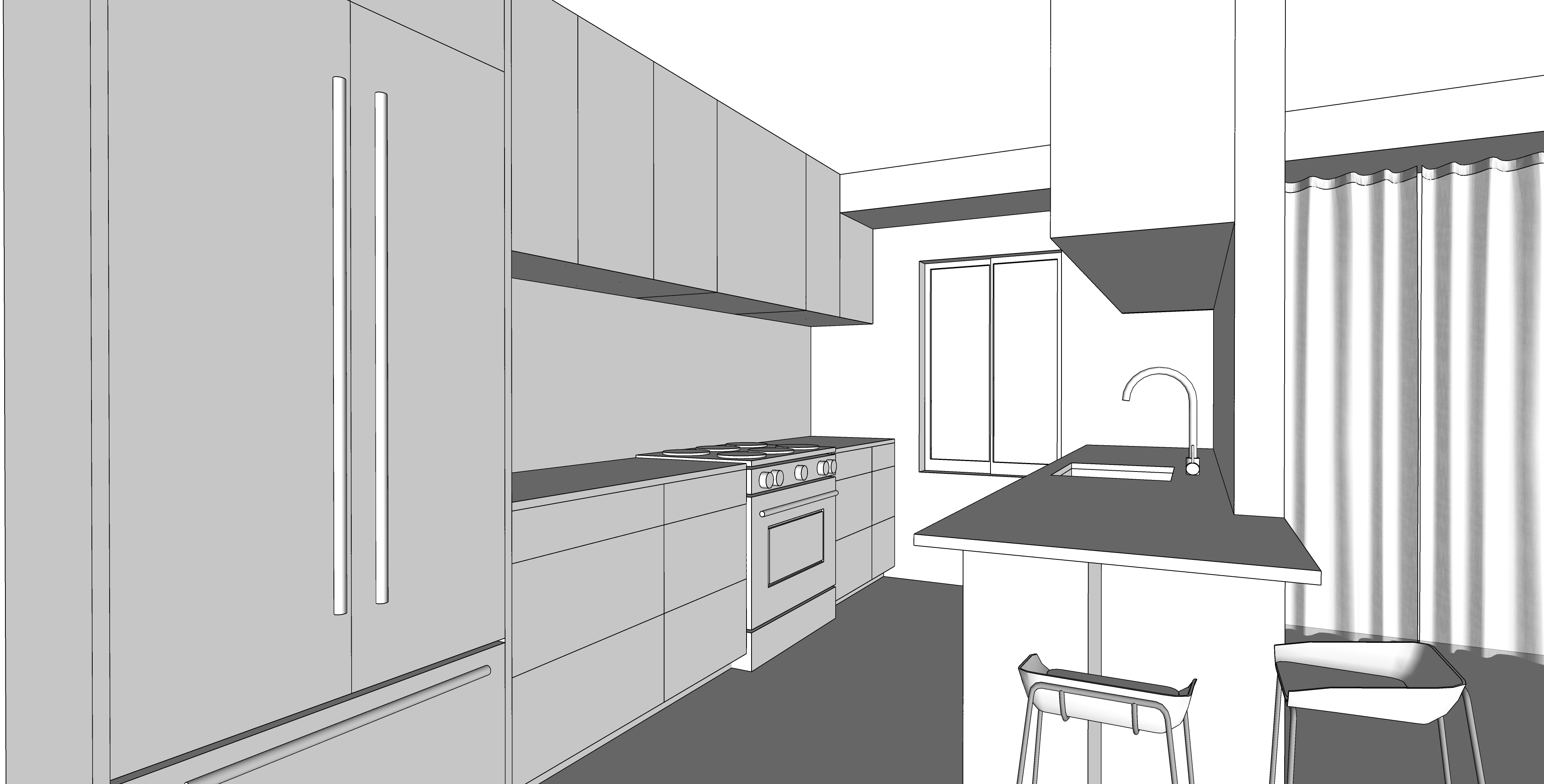 interior shot render a modern kitchen sleek walnut cabinets matte black countertops mirrored backsplash vague urban scene outside window light white oak floors for a warm atmosphere walls and ceiling are a soft ivory color under cabinet strip lighting modern clean lines warm and inviting lighting